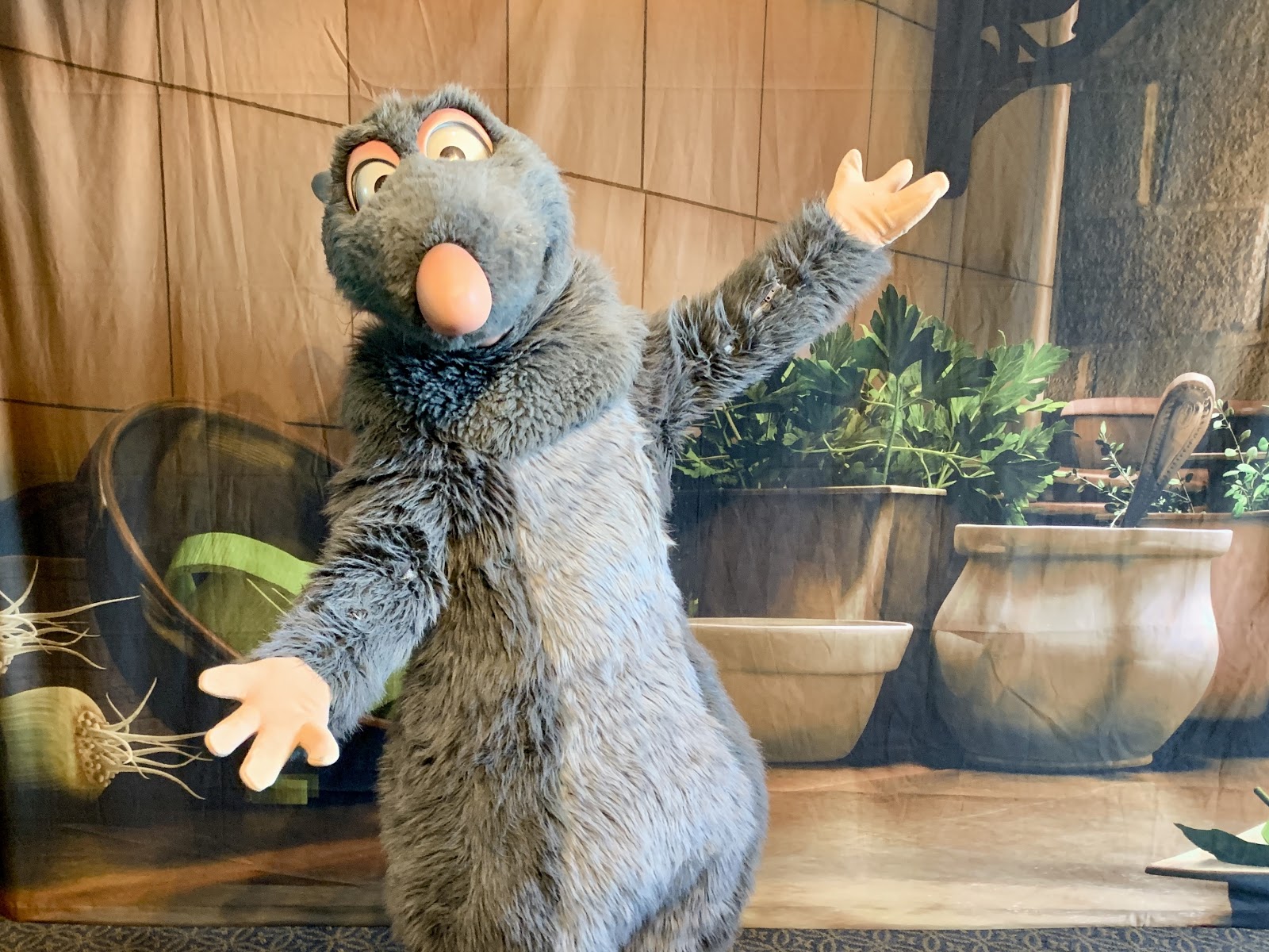 Rick asked a few trivia questions and that most knew but the stand out one, to me at least, was “what is the most popular item at the festival?” Many attendees called out personal favorites, but we learned it was actually Le Cellier Wild Mushroom Beef Filet Mignon not the long rumored Canadian Cheddar Cheese and Bacon Soup. But he did say that the soup was the third most popular. One of the highlights of Rick’s time was sharing with us the story of how he came up with the Swine Brine featuring Jim Beam Bourbon drink at the Flavors from Fire Marketplace including sending someone to get some Grey Poupon mustard to add some extra flavor. He did have a few minutes before our tasting adventure was ready to answer any questions, which I was lucky enough to be able to ask “what is the second most popular item at the festival?” His answer surprised most of the audience because it was not a bigger name item but Pão de Queijo: Brazilian Cheese Bread from the Brazil Global Marketplace! Rick did also give one of his favorite “food hacks” that he likes to take the Crispy Pork Belly and stick it inside the cheese bread and with that tip we were free to enjoy the lounge with a few offerings from the festival and have a chance to take a picture with the unofficial mascot Remy.
