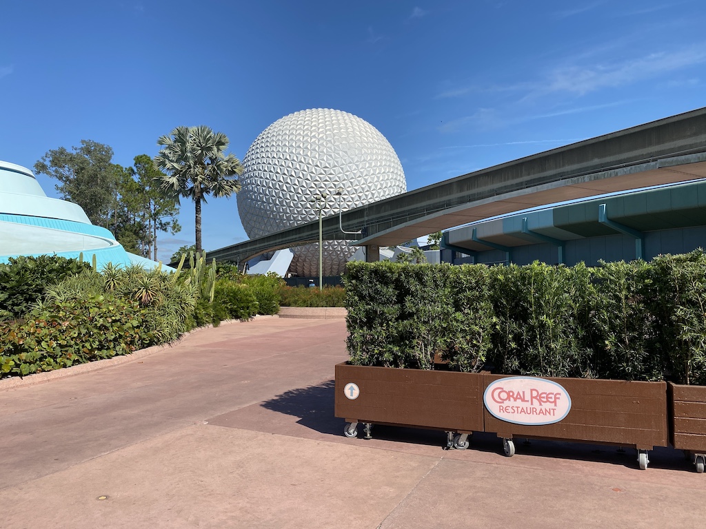 Outside of The Living Seas Pavilion is the Coral Reef Restaurant. During the overall Epcot construction, planter walls have gone up near the restaurant. These new walls feature a small sign and arrows guiding guests to the dining location where yes, you can still enjoy a delicious meal!