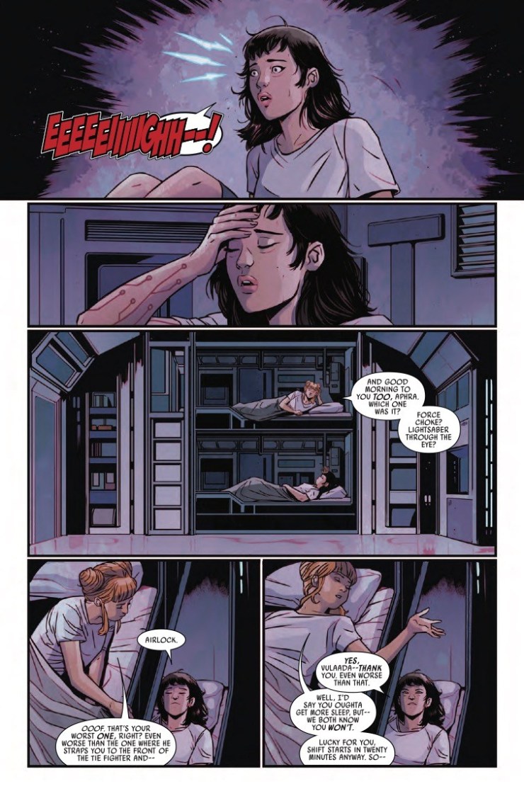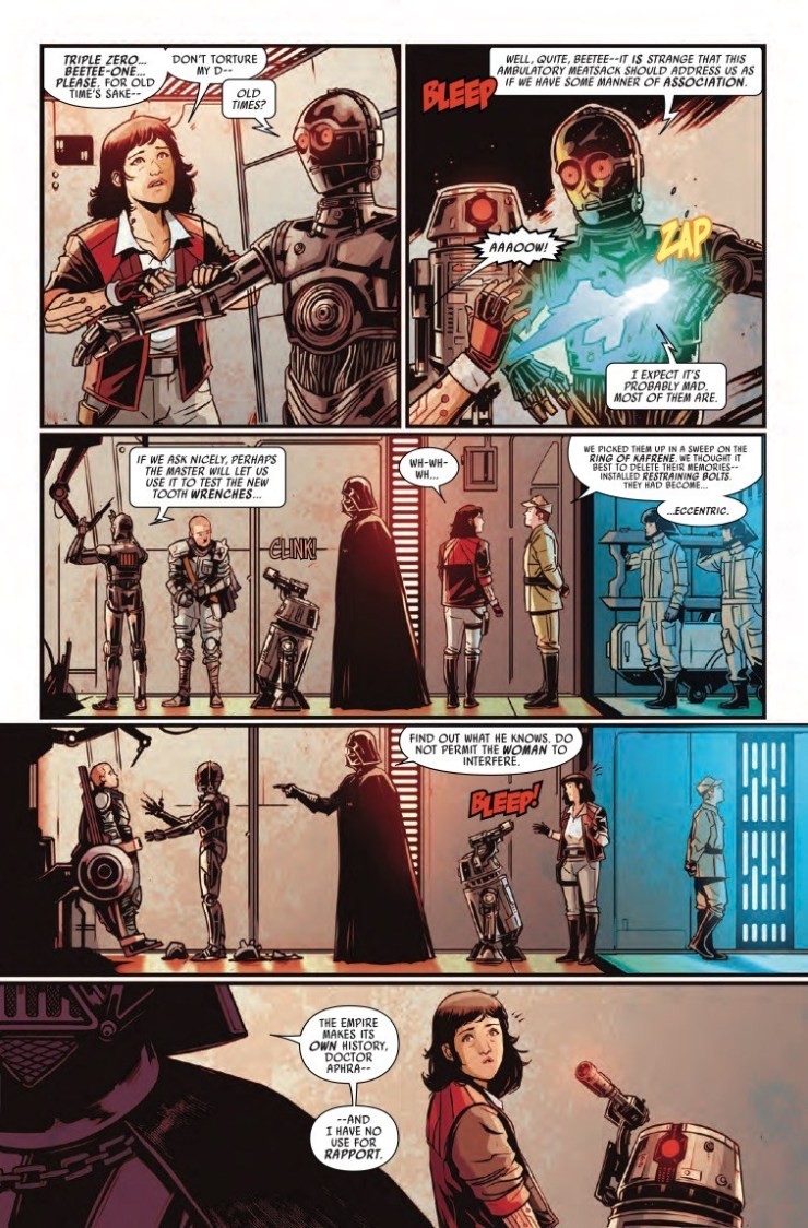 On the asteroid in question, Vader finds the shrine haunted by Force ghosts and dismisses them as mind tricks, but not before Chelli overhears him privately drop a tidbit about his own lost youth and innocence. As the group disembarks, Vader forces the Aphras to choose among themselves which one of them he will kill upon their return to the Executor: “I have need of only one Doctor Aphra.” Naturally, Chelli and her father have a heart-to-heart chat in the hold of the Imperial shuttle and Korin selflessly decides to sacrifice himself to BT-1… when suddenly the craft is rocked by a hostile boarding party. I won’t spoil which familiar character is among the besieging company, but we’ll pick up this synopsis when #39 is released in a couple weeks.