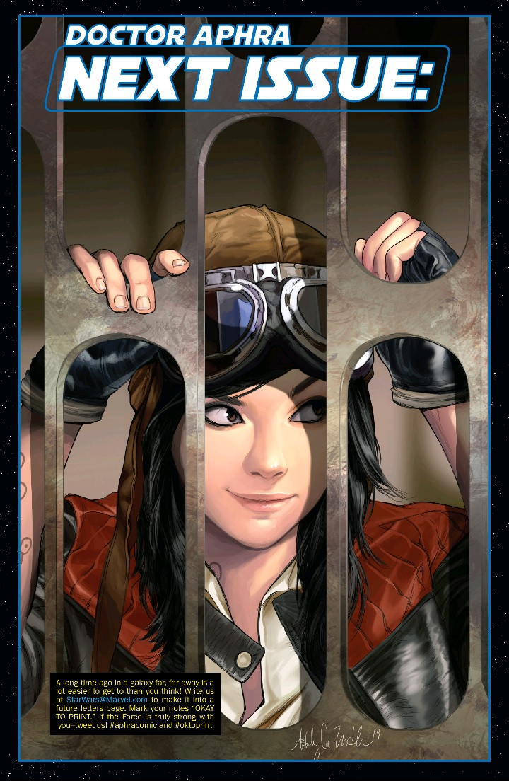 And now, several years later, Marvel’s Doctor Aphra is coming to an end, albeit temporarily, as it will relaunch with fresh-start numbering from #1 next year along with the main Star Wars title (It seems the two series are both finally catching up with the events of The Empire Strikes Back, and not a moment too soon). So as this current inaugural run of Doctor Aphra approaches its finale, we thought it would be a good idea to review its final arc, issue-by-issue.