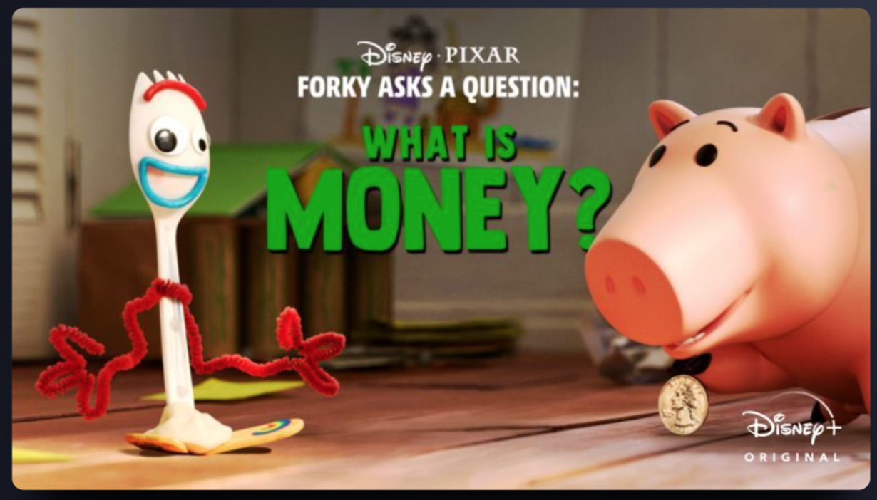 Forky the talking spork from Toy Story 4 gets his own short series on Disney+ and the premiere finds him questioning Hamm about money and its origins.