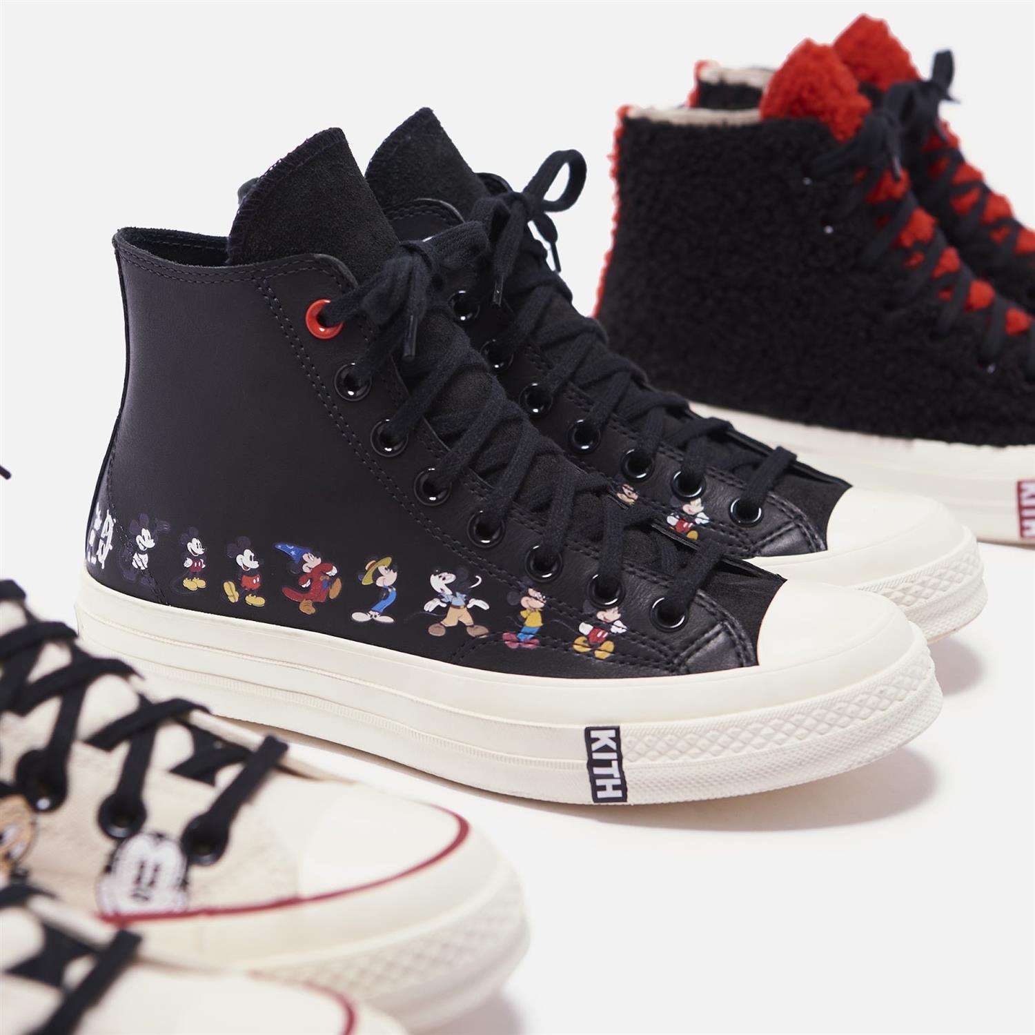 Mickey might be turning 91, but to celebrate the anniversary of Mickey Mouse's 90th Birthday, Kith reprises it's partnership with Converse for a three part collaboration with Disney. The collection is rounded out by the addition of three core styles of Converse 1970’s Chuck Taylor. One executed in classic canvas with varying styles of Mickey Mouse's face, the other, an all leather rendition with it’s own timeline of Mickey Mouse artwork and finally a Sherpa style, color blocked red and black to represent the original colors of this timeless Disney character. All styles of converse are co-branded on the sole and offer two styles of co-branded laces. All converse 1970's Chuck Taylors will be available ranging sizes 3.5Y-13 Mens. Disney x Kith releases on Mickey’s 91st birthday (November 18) at all Kith shops and at 11AM EST on Kith.com.