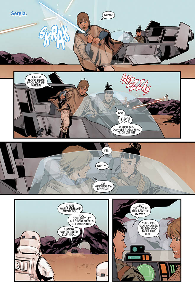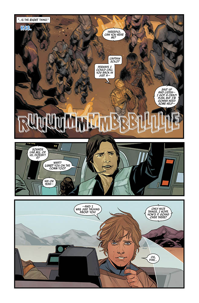 Instead, we get the continuation of the “Rebels and Rogues” storyline and our heroes’ three-pronged mission to “thwart the evil Galactic Empire,” as the issue’s opening crawl states. Luke Skywalker is on the planet Sergia evading stormtroopers on lizard-back, C-3PO and Chewbacca are on the asteroid K43 facing off against Vader and trying to save a sentient species of rock people, and Han Solo and Princess Leia are attacking a Star Destroyer with a tiny shuttle to help out Leia’s ex-boyfriend (Shouldn’t they be running into a bounty hunter on Ord Mantell by now? I have a sinking feeling we’re never going to get to that particular fireworks factory.)
