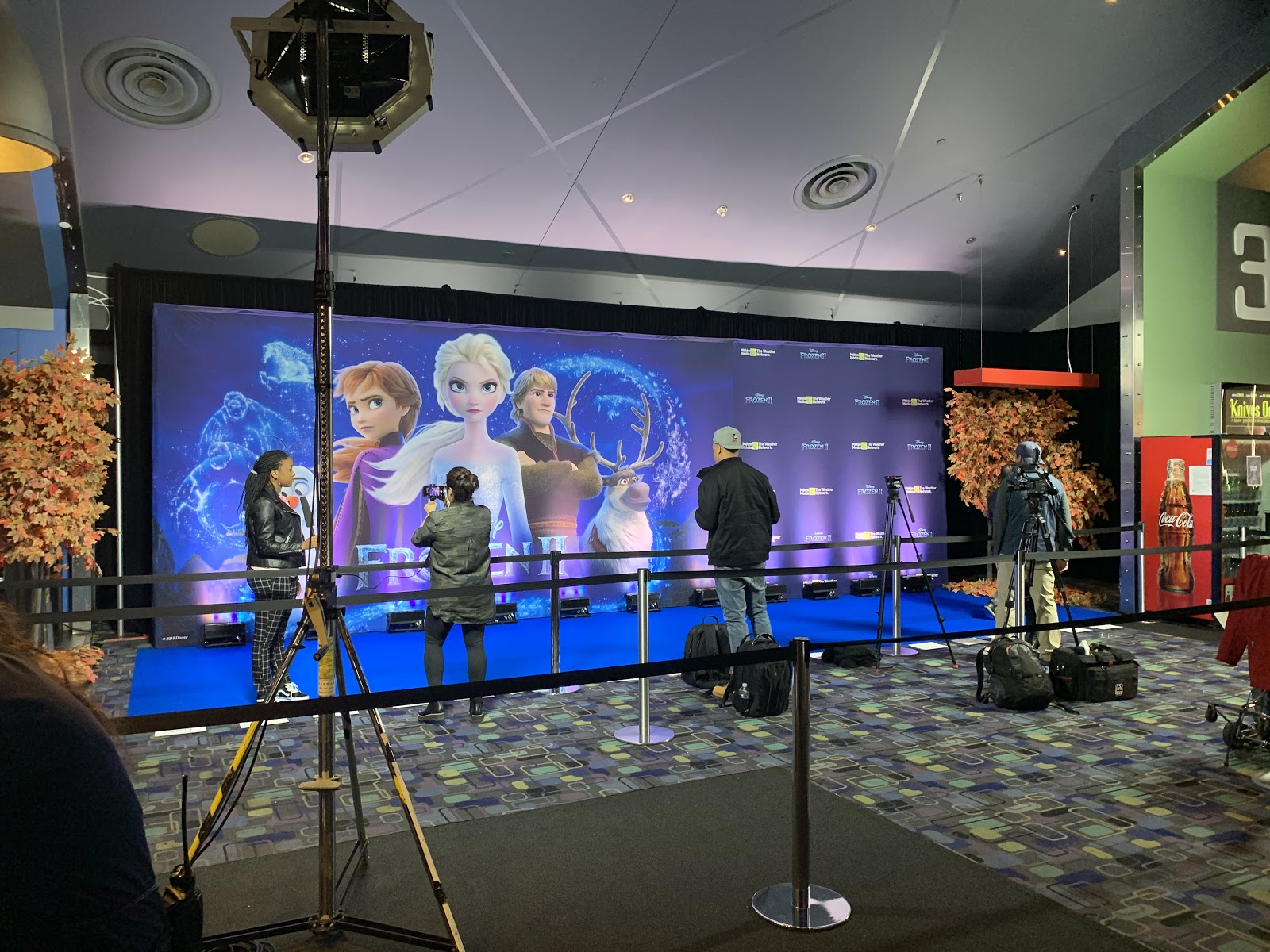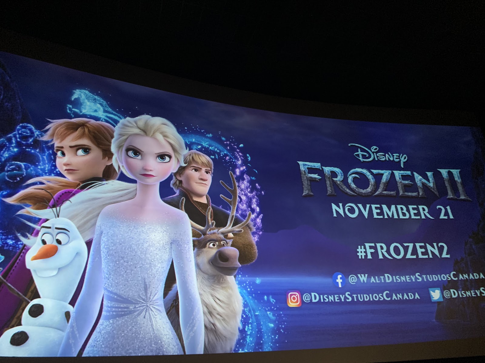 Just a few steps away, I settled into the theatre to wait. And wait. And wait. Then I waited some more. Over an hour after gaining my admission to the theatre, the countdown clock began, and we were treated to commercials for Disney + and theatrical releases. Once the adds ceased the screen went blank and guests got up and sought the bathroom and snacks at the concession stands. So many Anna and Elsa cosplayers, from young to old were filling the theatre by now.