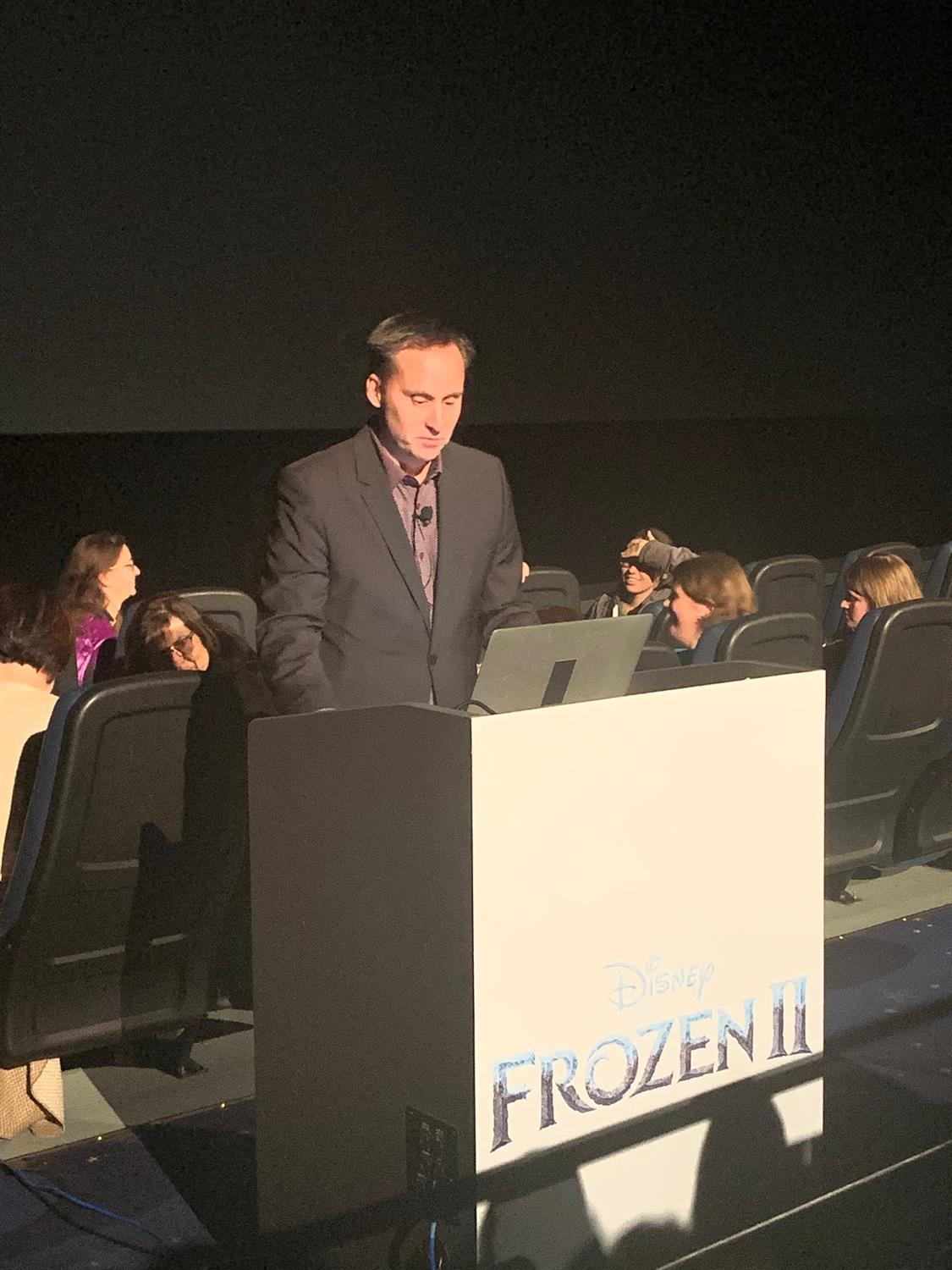 The show commenced with Greg Mason, Vice President of Marketing for the Walt Disney Studios in Canada. Standing in front of a podium with Frozen II emblazoned on the front, he welcomed us to the event, and started talking about the film that everyone in the theatre was so eager to see.