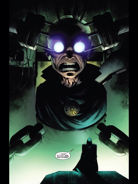 To give a quick summary without giving away too much (I’m not even sure there’s much I could give away), Doctor Doom has done something to eliminate the heroes we know and love to create a very different future. Now, he is holding Uatu the Watcher as a prisoner so that he can see all that is happening to ensure that nothing is done to undo his work.