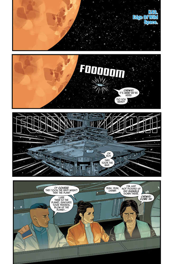 Star Wars #75 (written by Greg Pak with art by Phil Noto) concludes the “Rebels and Rogues” arc that began over the summer and also serves as Part II of “Destination: Hoth,” the plotline that gets the Rebel Alliance closer to inhabiting the frozen planet where Empire begins. We pick up where #74 left off, with Chewbacca grappling with Darth Vader on the asteroid K43, and Han Solo en route in a shuttlecraft accompanied by Princess Leia and her ex-boyfriend Dar Champion. Our heroes are intent on luring an Imperial Star Destroyer to its doom by blowing up the asteroid when it comes near, but complications on the surface are getting in the way of the mission.