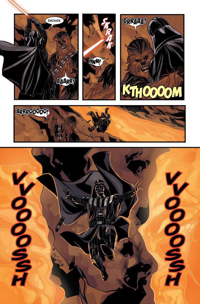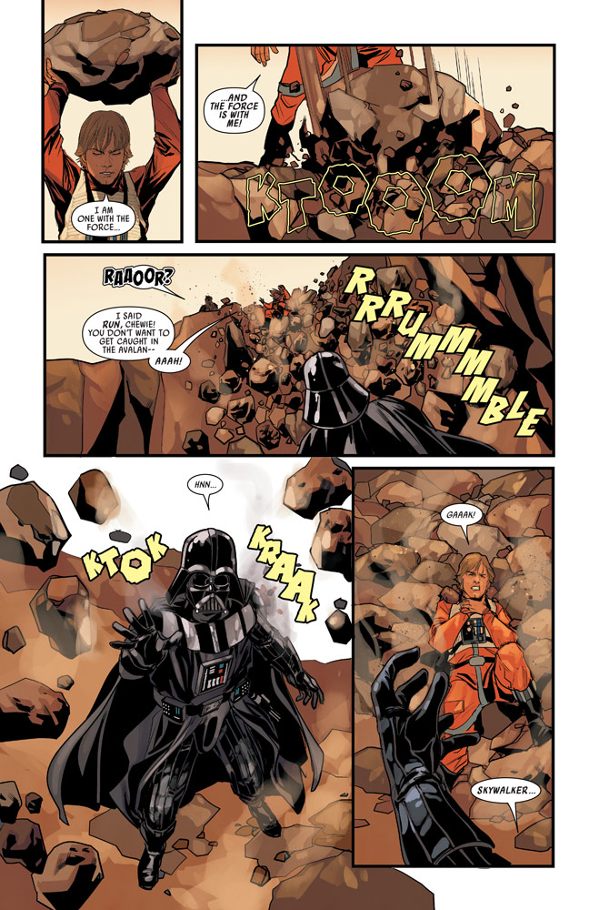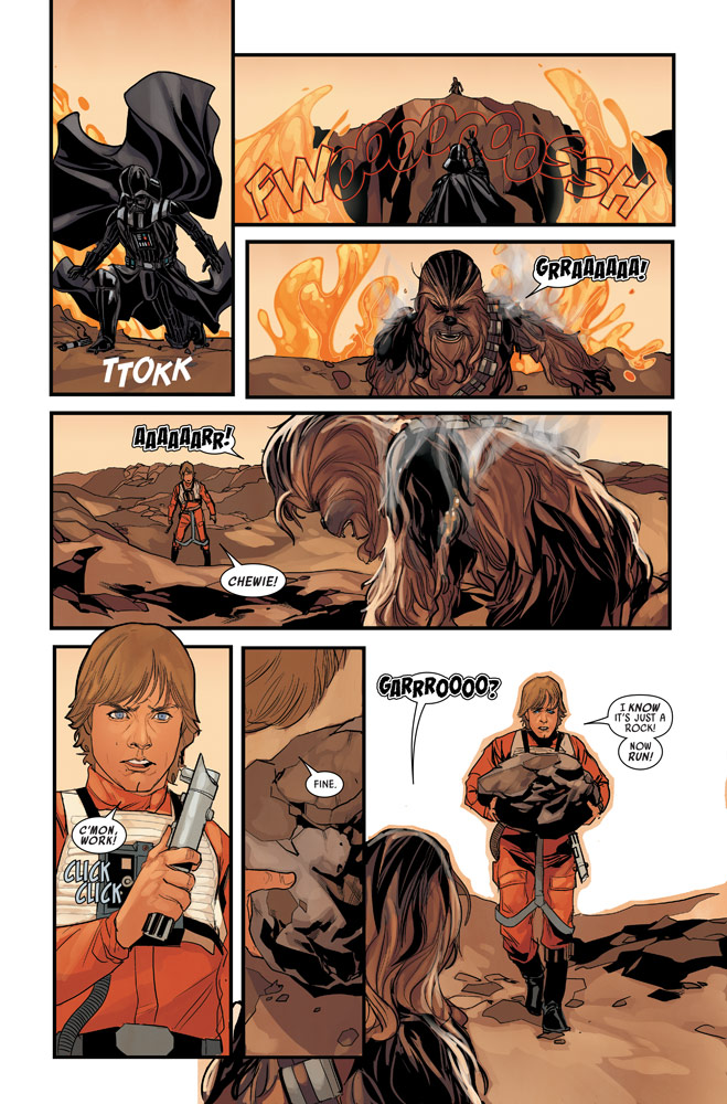 Luke Skywalker helps Chewie take on the Dark Lord of the Sith, the gang reunites and faces off with Vader and some stormtroopers, C-3PO bids farewell to his new rock creature friends the Kakrans, and the explosion countdown deactivated last issue gets an unexpected kick-start again, meaning certain doom for all who don’t escape K43 as soon as possible.