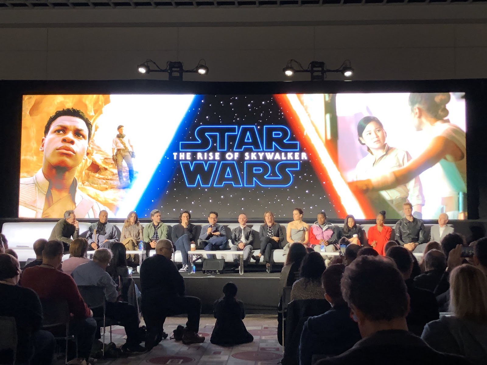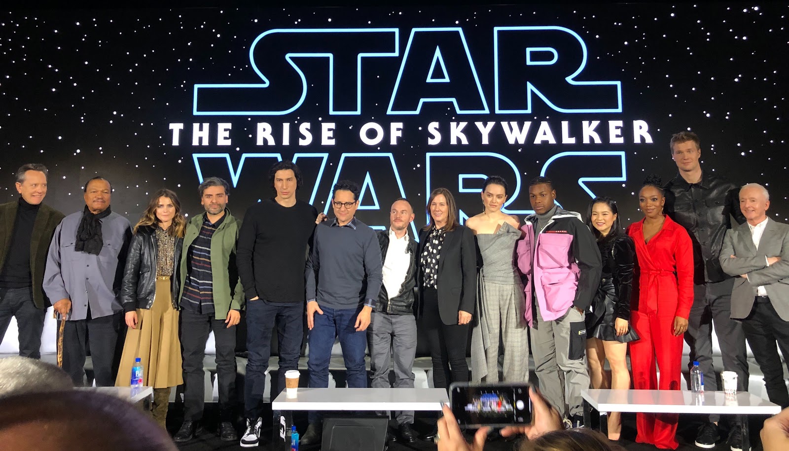 Yesterday the company hosted a global press junket for Star Wars: The Rise of Skywalker in Southern California, and its centerpiece was an hour-long press conference featuring the film’s star-studded cast and talented creative team: actors Daisy Ridley (who plays protagonist Rey), Adam Driver (the villainous Kylo Ren), John Boyega (Finn), Oscar Isaac (Poe Dameron), Kelly Marie Tran (Rose Tico), Joonas Suotamo (Chewbacca), returning fan favorites Billy Dee Williams (Lando Calrissian) and Anthony Daniels (C-3PO), franchise newcomers Naomi Ackie (Jannah), Keri Russell (Zorii Bliss), and Richard E. Grant (Allegiant General Pryde), plus producer and Lucasfilm president Kathleen Kennedy, co-writer Chris Terrio, and co-writer / director J.J. Abrams.