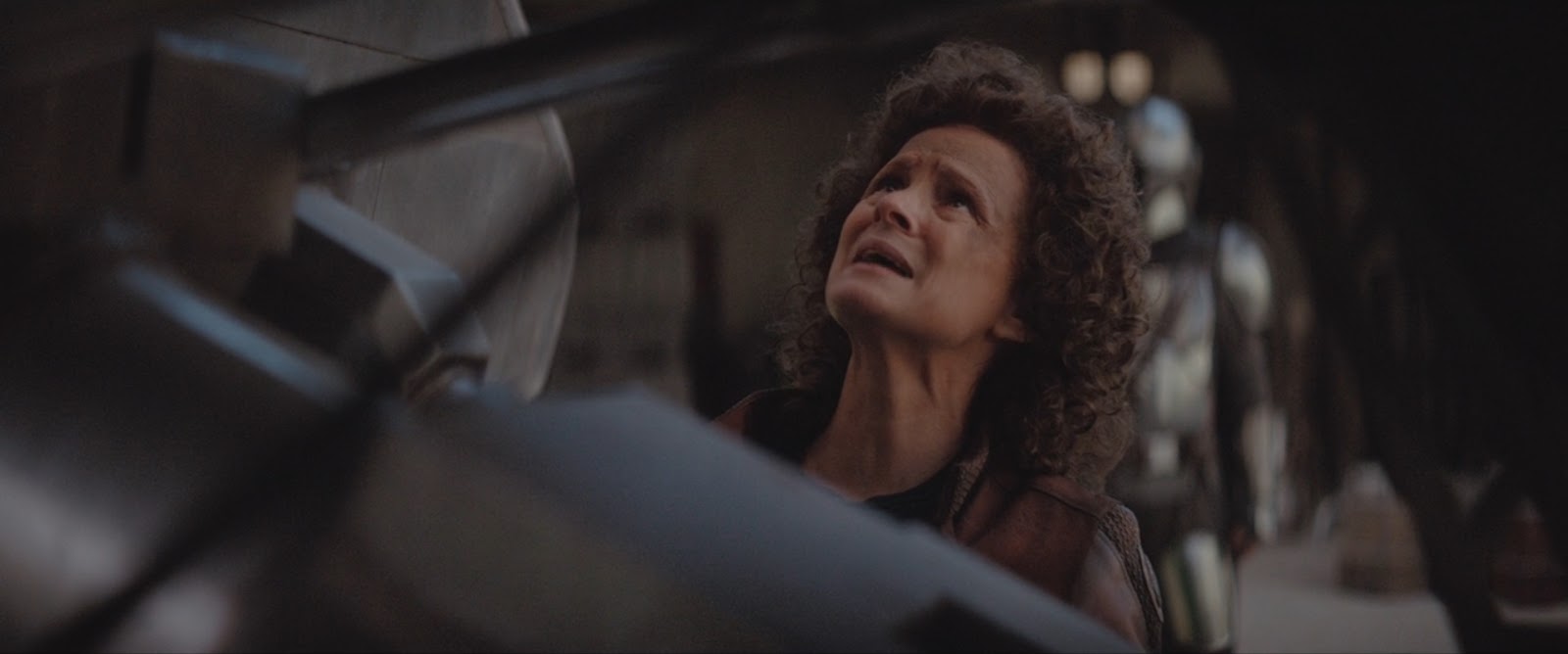 After a harrowing space battle while being pursued by another bounty hunter mid-journey, the Mandalorian must land his yet-again-damaged ship the Razor Crest in Mos Eisley Spaceport (yep, that wretched hive of scum and villainy) and hires a local mechanic named Peli Motto, played with the usual amusingly oddball eccentricities by comedian Amy Sedaris of Comedy Central’s Strangers with Candy and Netflix’s BoJack Horseman. This series has a knack for casting unlikely guest stars, and Sedaris was indeed a welcome one.