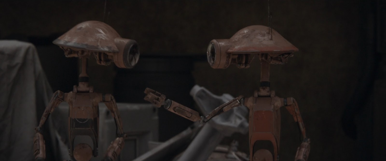 Of course our protagonist foolishly leaves behind Baby Yoda sleeping in his ship, and Motto soon discovers him (her? it?), but instead of acting menacingly toward The Child, she cares for the adorable little creature-- with the intent of charging Mando more for babysitting upon his return. Meanwhile, the title character pays a visit to another very familiar location from A New Hope, namely Mos Eisley Cantina (formerly known as Chalmun’s Cantina), which has apparently changed its no-droid policy to the point where the droid detector has been entirely removed and the bar is even being operated by EV droids.