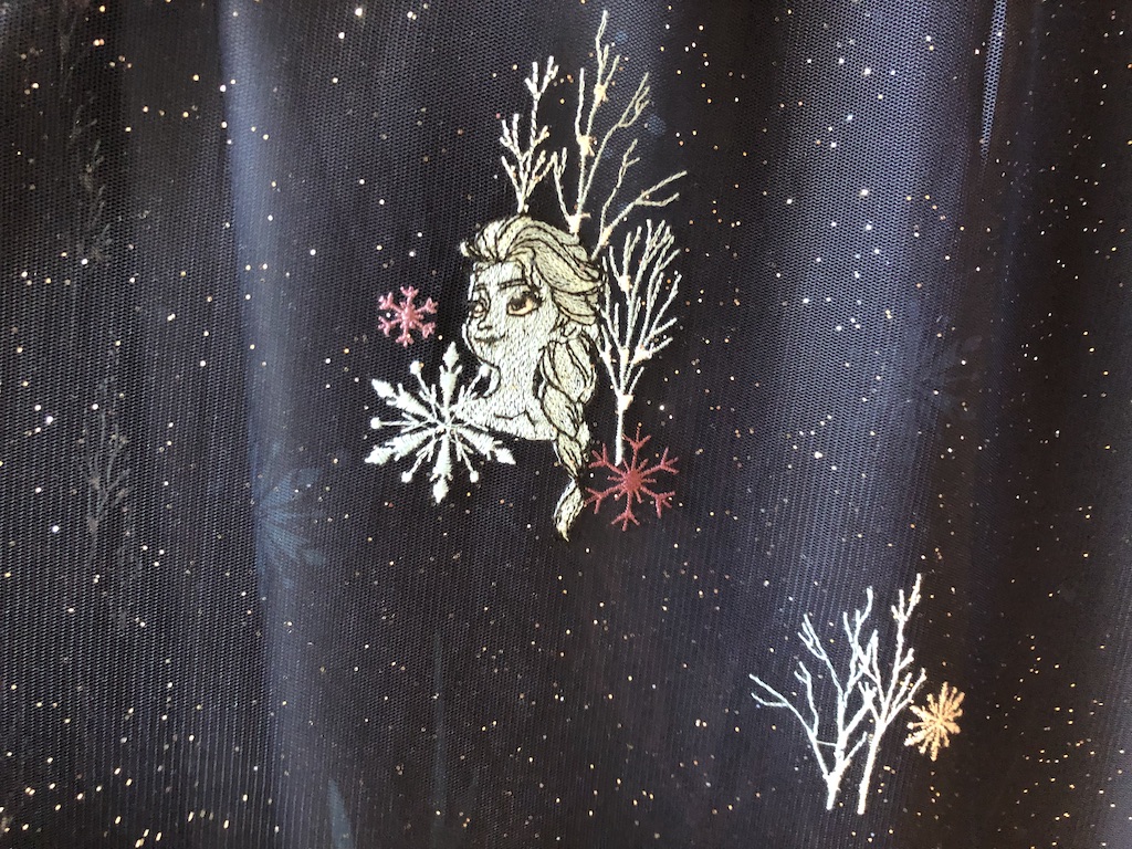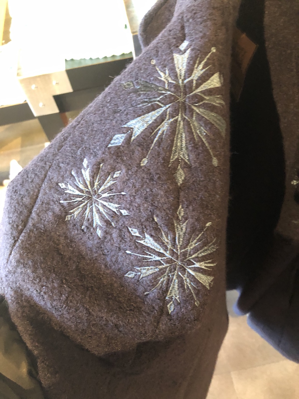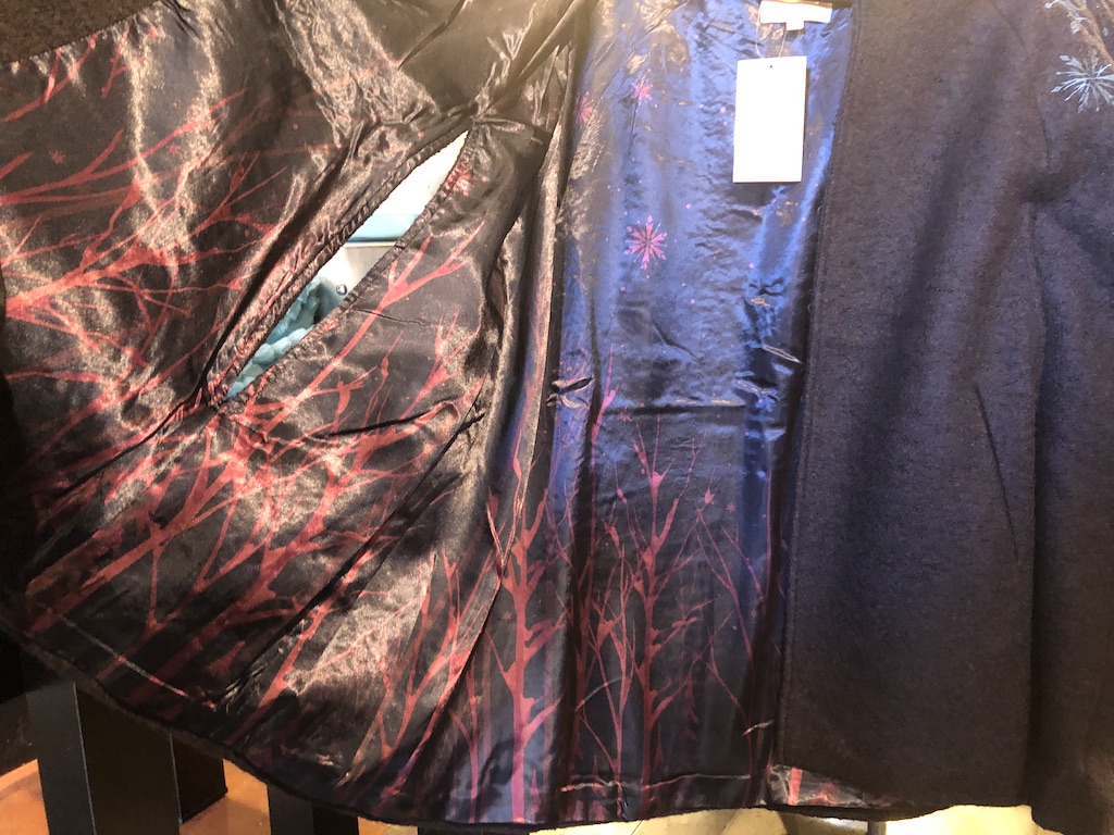 This dark blue cape features snowflakes on the shoulders and pink trees on the inner lining. If I had room in my suitcase, this would be coming home with me!