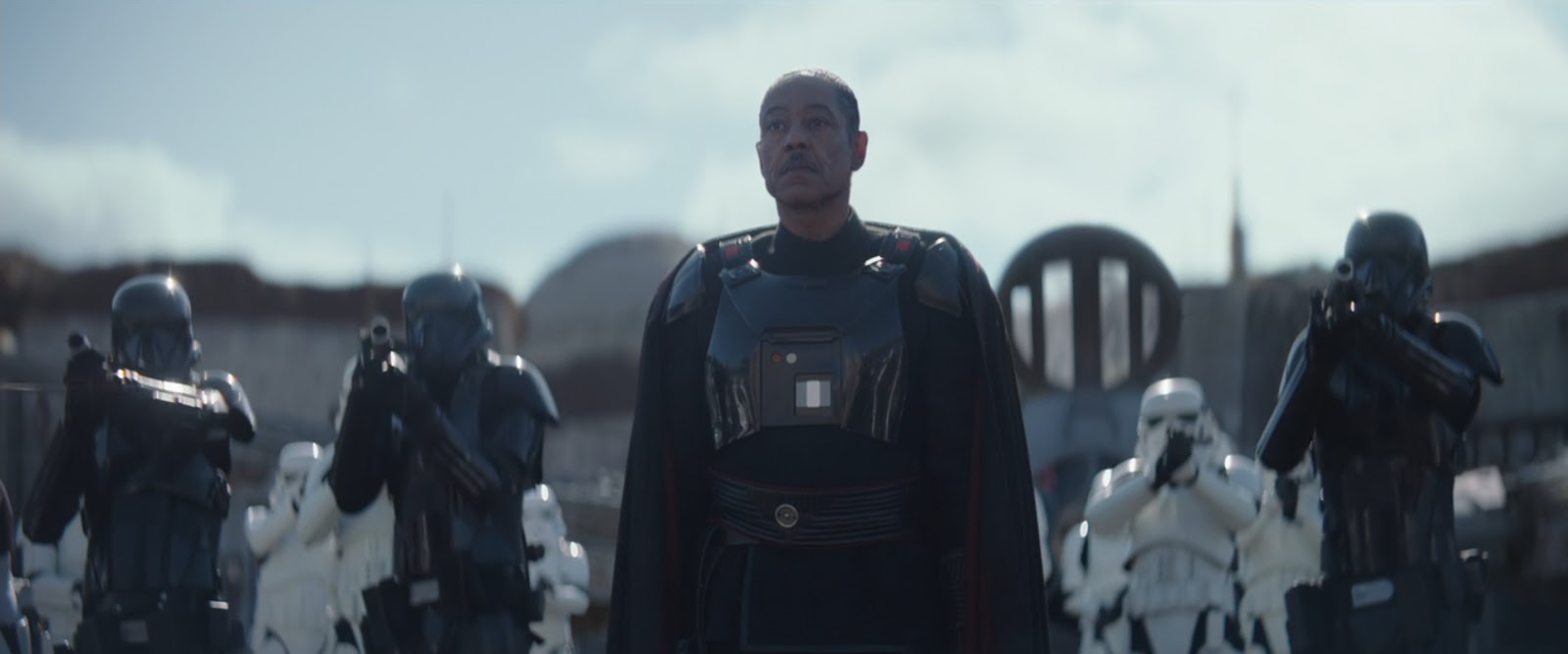 As has become the standard for this series, there's danger and betrayal around every corner once the group makes it way to its goal: giant winged beasts attack the party at night after they've met up with Carga and his goons, and the guild leader himself also has a few tricks up his sleeve. But things take a turn for the optimistic when Baby Yoda demonstrates his healing ability (coincidentally-- or maybe not?-- setting up a major plot point for this week’s release of Star Wars: The Rise of Skywalker), and Mando and Dune finally find themselves with another trustworthy ally. Kuill is sent back to the Razor Crest to protect the Child, and our heroes head into town with a plan. Sure it’s the old “Wookiee Prisoner” trick, as they called it in Lost-- as referencing A New Hope, of course-- but it works well enough until Gideon arrives with his menacing TIE Fighter and a battalion of stormtroopers and things go ballistic.