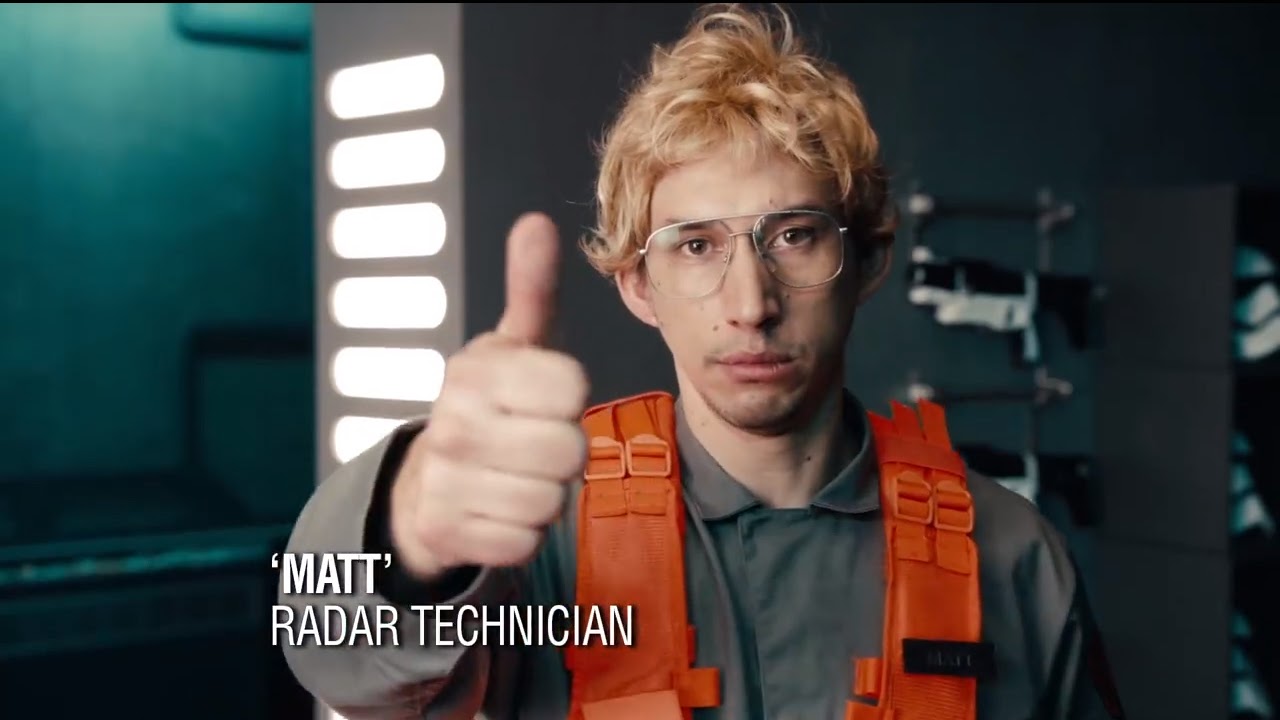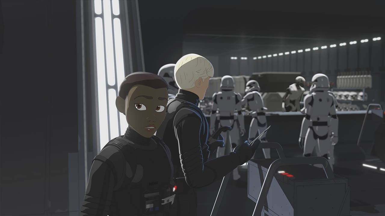 Aboard the First Order Star Destroyer, Kaz’s former friend Tamara Ryvora (Suzie McGrath) and fellow TIE Fighter pilot Jace Rucklin (Elijah Wood) are bored with their engine inspection duties until Lieutenant Galek (Christine Dunford) sends them on a supply run to the Titan, which Tam is surprised to find is the same model of station as the Colossus. After they arrive, she spots Kaz disguised as a First Order technician-- in orange vests which serve as an obvious nod to the viral Saturday Night Live “Undercover Boss” Kylo Ren sketch starring Adam Driver from several years back.