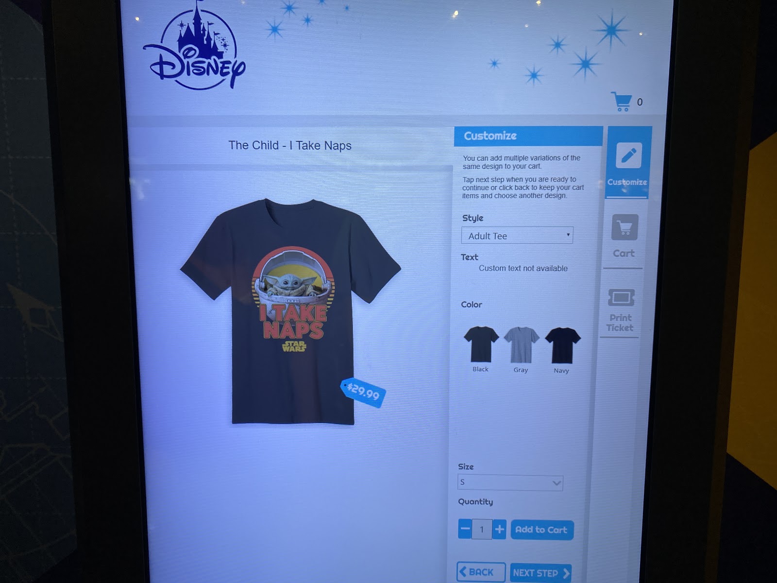The new merchandise offering is now available in Tomorrowland at Magic Kingdom in the gift shop located at the exit of Space Mountain. Guests can choose from two custom designs: Baby Yoda without text or Baby Yoda “I Take Naps”
