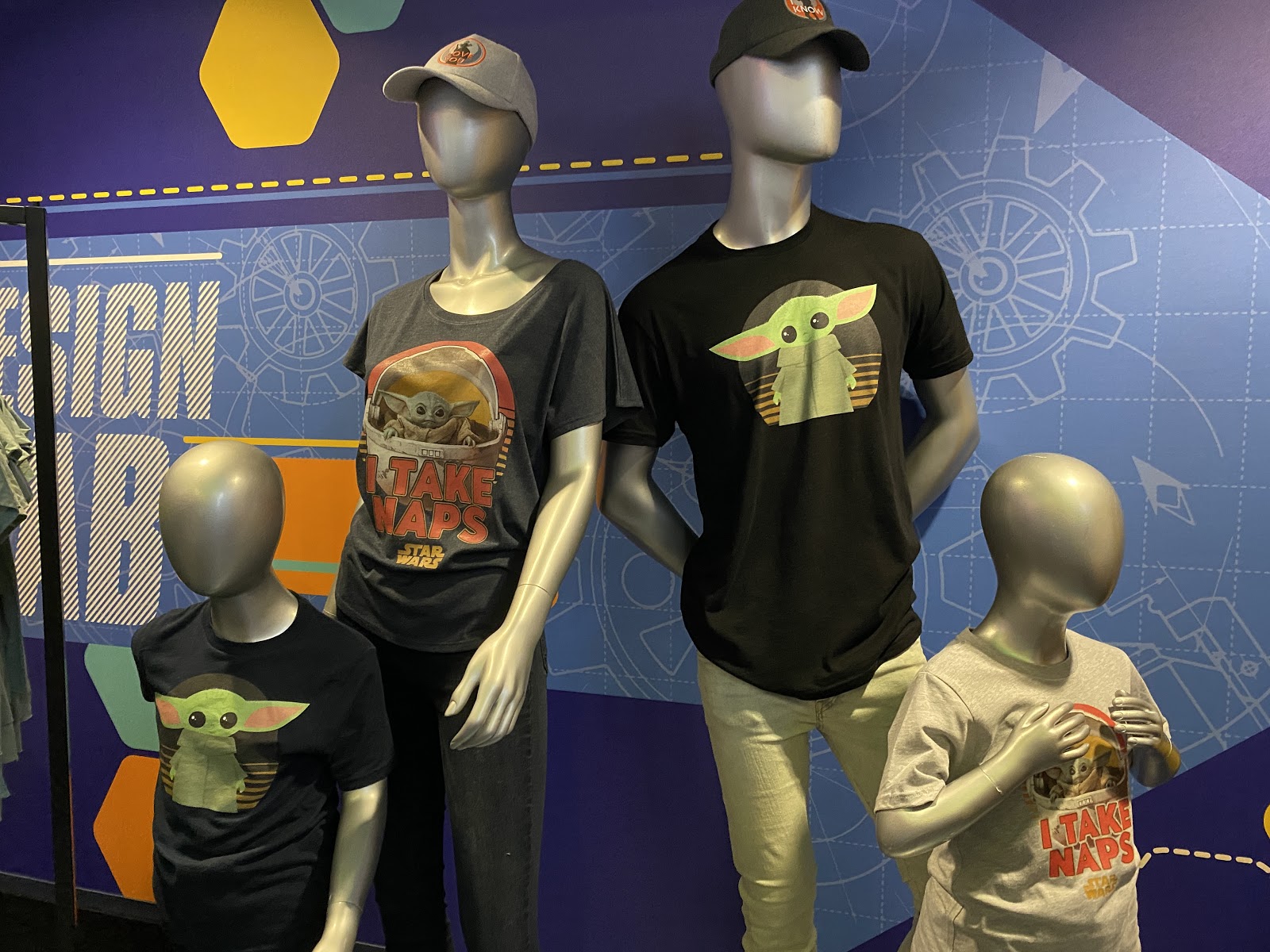 The new merchandise offering is now available in Tomorrowland at Magic Kingdom in the gift shop located at the exit of Space Mountain. Guests can choose from two custom designs: Baby Yoda without text or Baby Yoda “I Take Naps”