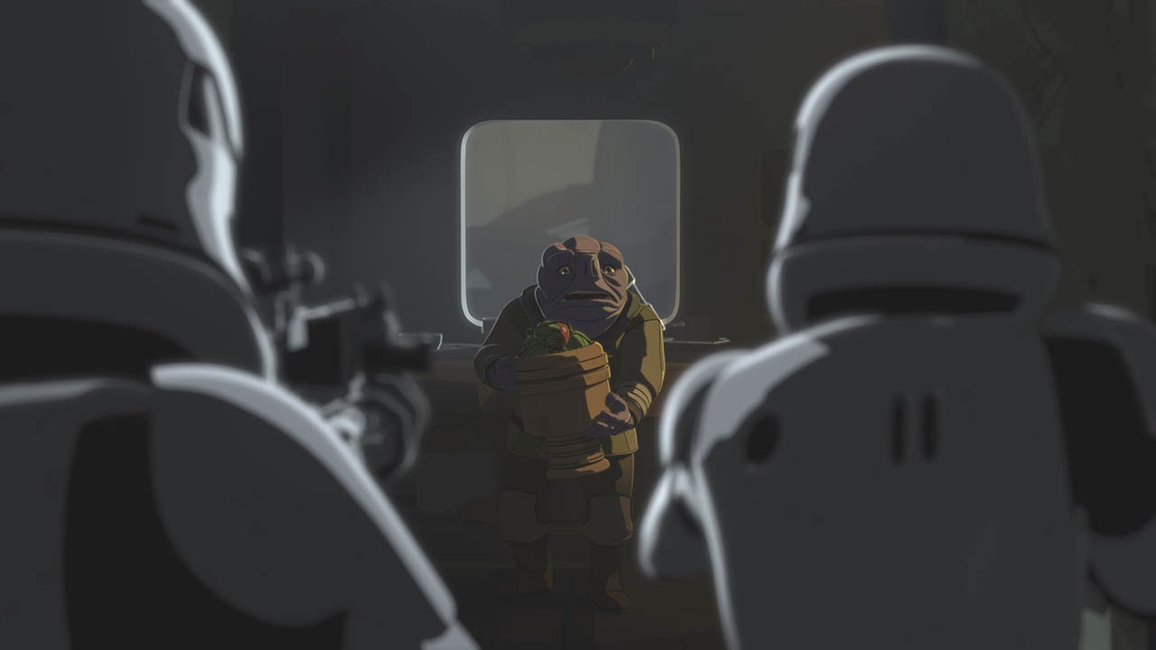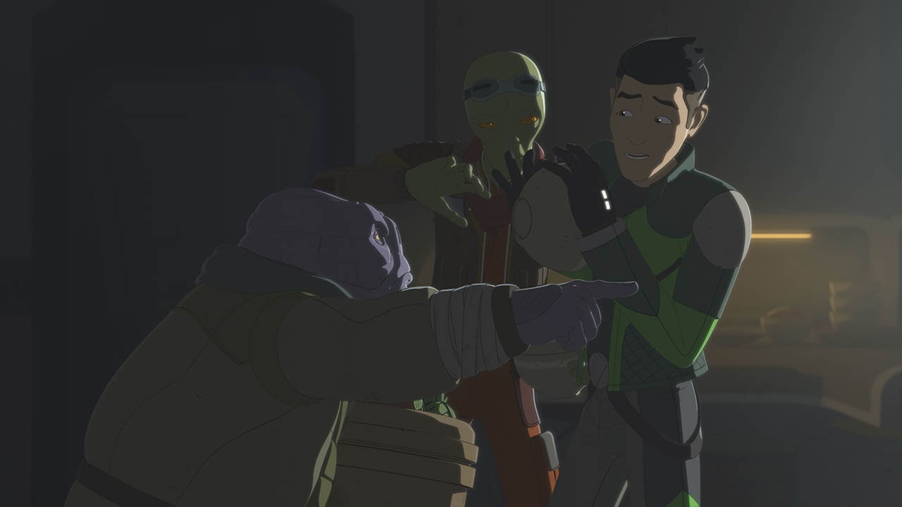 When the shuttle enters orbit, it comes face-to-face with the First Order star destroyer, but the Colossus jumps back in to gather its wayward crew members and the disappears again once everyone is on board. In the hold, Neeku (Josh Brener) is surprised to find Kaz wearing stormtrooper armor again. Norath asks Kaz to come with him and help the Resistance, but Kaz says he’s not ready to leave his friends just yet. They head to Aunt Z’s for a drink. I was almost expecting this episode to end with another cliffhanger, but the (perhaps temporary) addition of Norath to the crew is interesting enough.