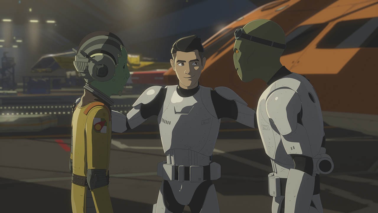 Commander Pyre (Liam McIntyre) calls Tagrin via communicator and tells him to bring his prisoners to the main hangar on Varkana, while the planet’s citizens scramble as the First Order arrives. Meanwhile, Resistance spies Kazuda Xiono (Christopher Sean) and Norath Kev (Daveed Diggs) see their friends being taken away. Kaz thinks Ax had intentionally let the distress beacon from last episode get out to lure more Resistance fighters into his trap. After landing, Pyre orders his troops to secure the perimeter around the hangar, and Tagrin promises to capture the remaining targets.