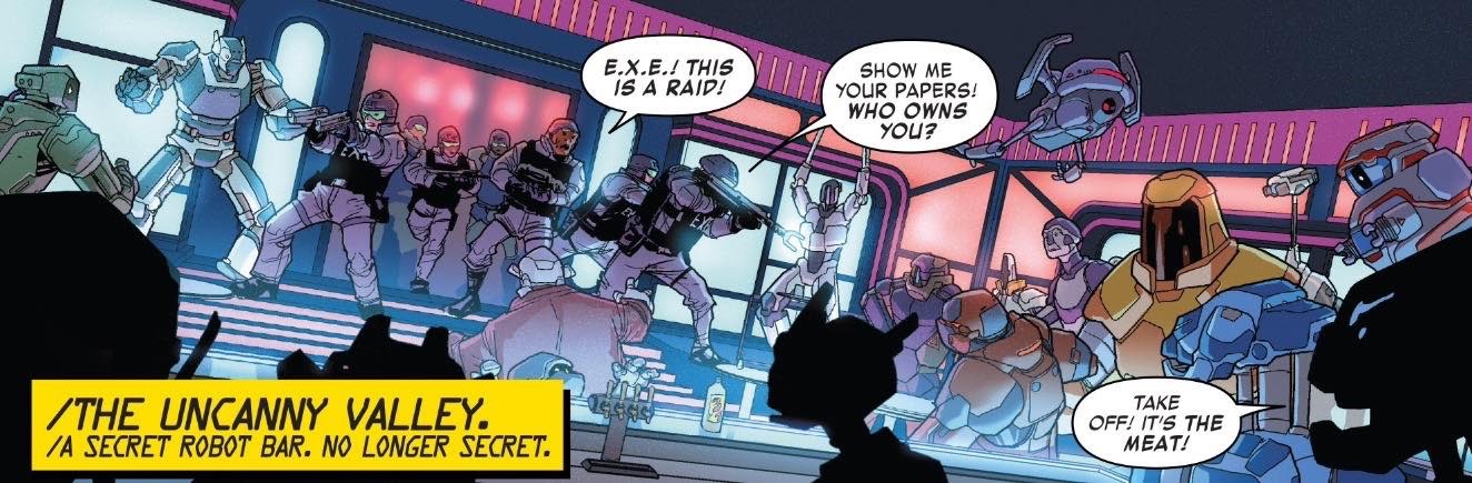 As I alluded to, it does seem as though the robot revolution could become a more serious part of the series in future issues, which could be a good thing. However, there were also some things I don’t like about this. For example, the robots refer to humans as “the meat” or “meatbags” numerous times. At one point they even refer to other robots as “metalheads.” After a while, it starts to get a bit cringey.