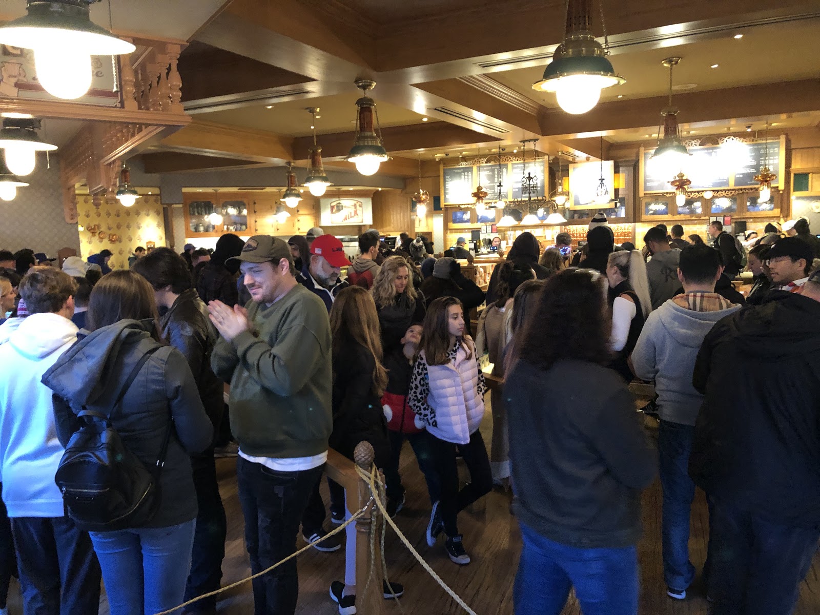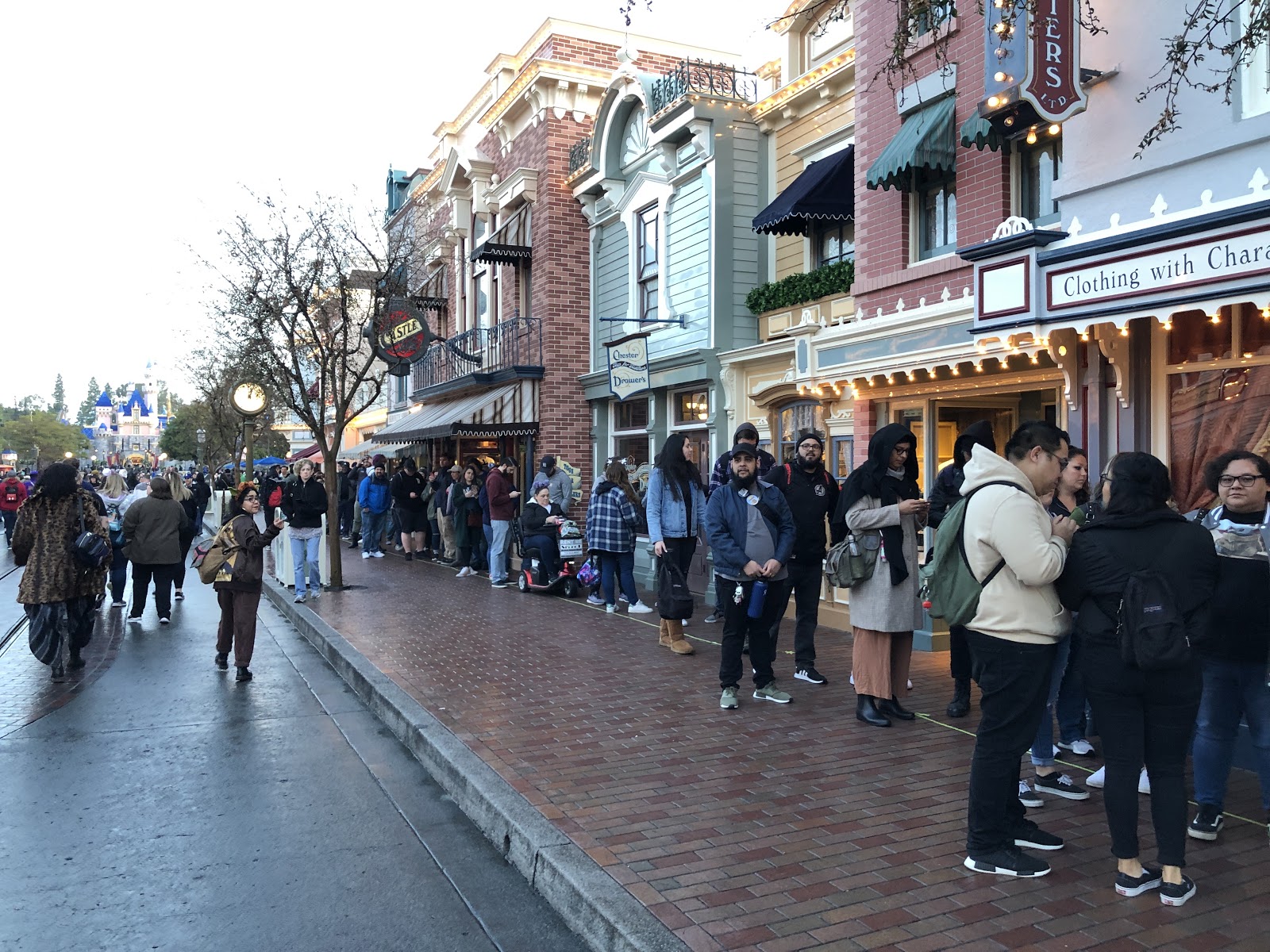 Guests lined up from the very early morning hours to be among the first admitted through Disneyland’s front gates for opening day of Star Wars: Rise of the Resistance, but once they started flooding into the park around 5:45 AM, there was still more than two hours to wait until the virtual queue system opened and they could begin joining boarding groups. This meant big crowds along Main Street, USA and very long lines for Disneyland’s Starbucks location.
