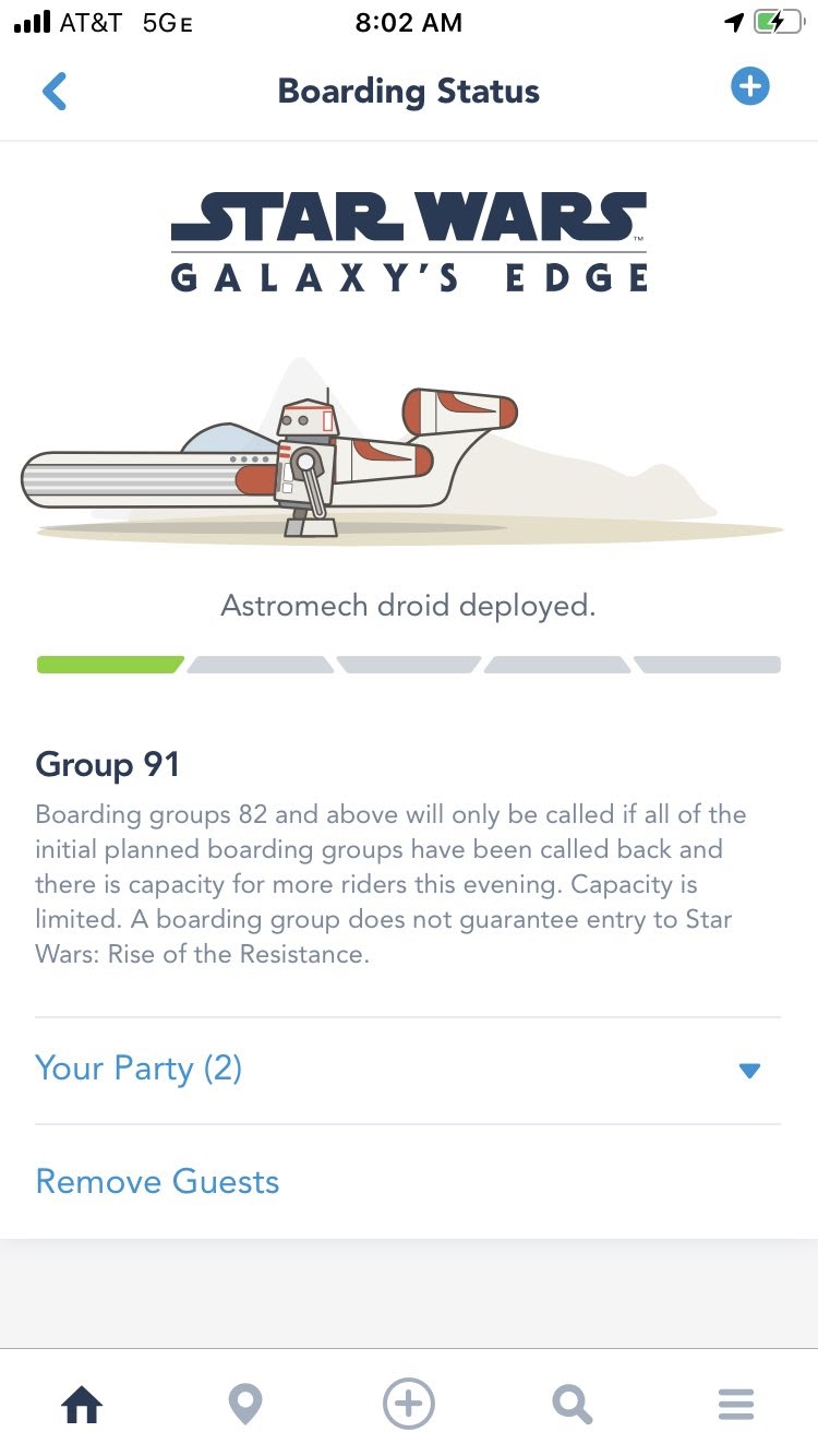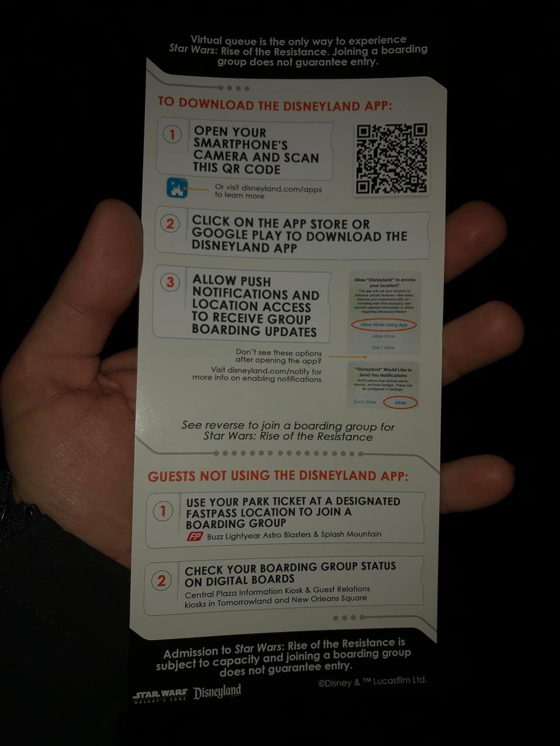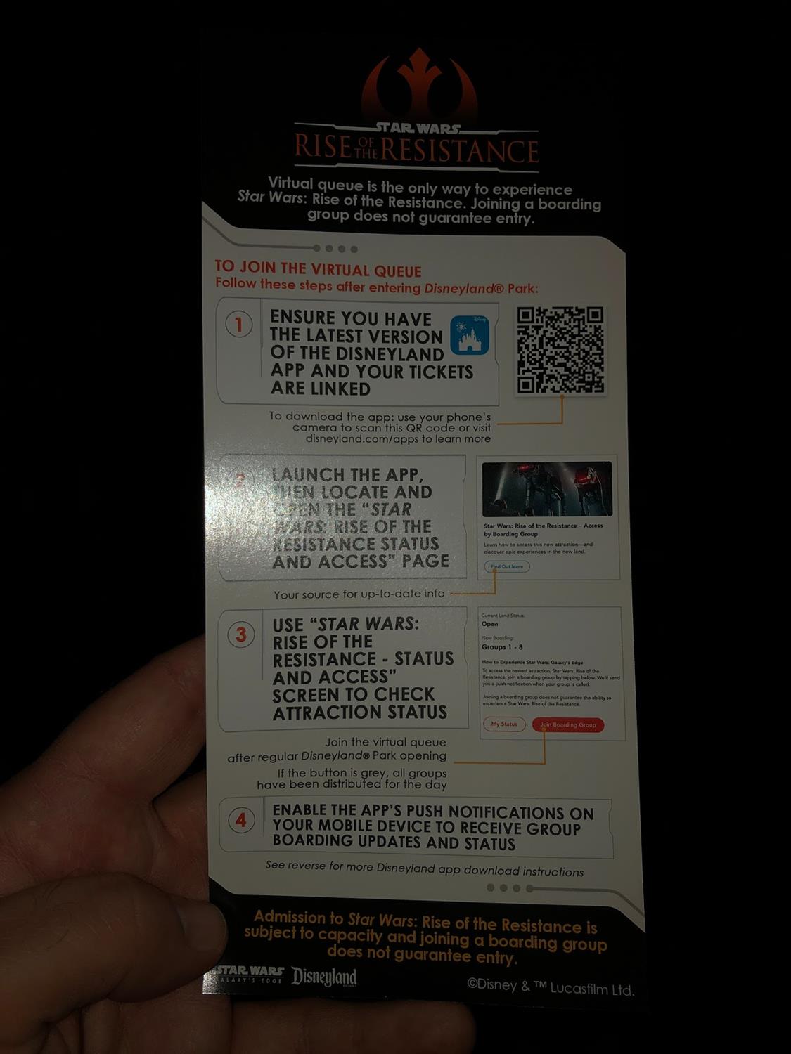 Then, once 8:00 AM rolled around, everyone waiting in the park pulled out their phones, booted up the Disneyland app, and took a stab at getting a boarding pass for Star Wars: Rise of the Resistance. After a minute or so of traffic clogging up the app, we ended up with #91, which should put us on the attraction sometime in the late afternoon unless the attraction experiences delays due to technical difficulties. Cast Members had passed out informational flyers before the park opened, in case anyone was unfamiliar with the virtual queue process.