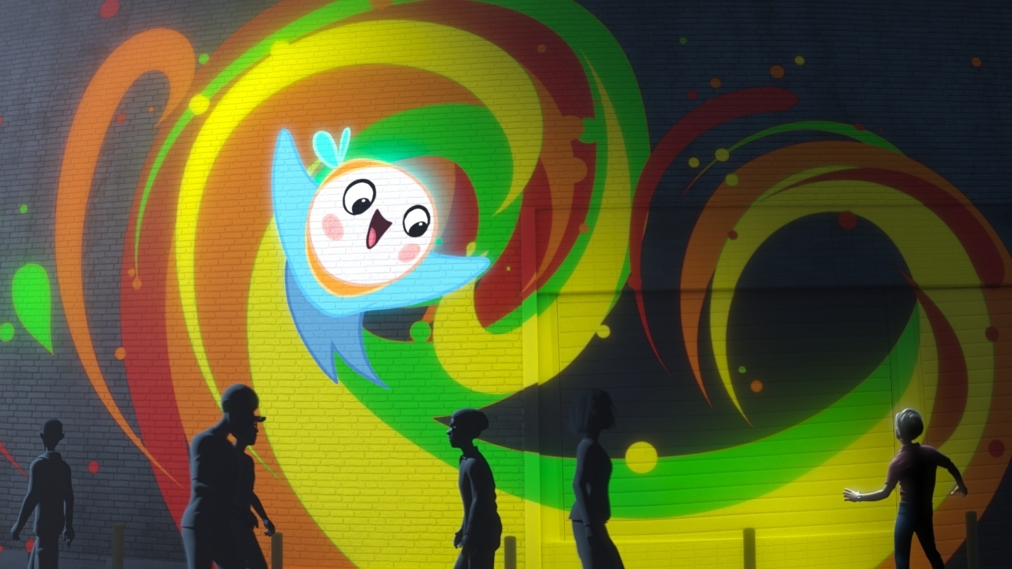 We are introduced to a nameless, faceless silhouette of a man who misses his bus, causing him to stop and notice some street art. In that moment, the art comes alive, picking him up and taking him on an exhilarating thrill ride through skyscraping streets of color and excitement.