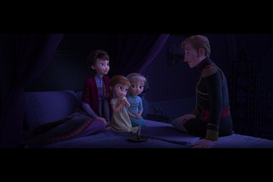 To make Ahtohallan appear to be a frozen river of memory, over 80 shots from Frozen and Frozen 2 were selected to appear as memories on the dome of the large room and digitally treated to appear to have a murky smeared appearance as if they were coming from inside the ice. Patterns overlap and refract the view of the images to better represent the concept of memory and how some are clearer and easier to access than others. Ultimately, Elsa’s prominent memory is that of her mother, Queen Iduna. Not only is she the largest and clearest of all the images reflected on the dome, the animators put little images of her in Elsa’s eyes, so that even when the camera switches away to close in on Elsa’s face, her connection to her mother can still be felt.
