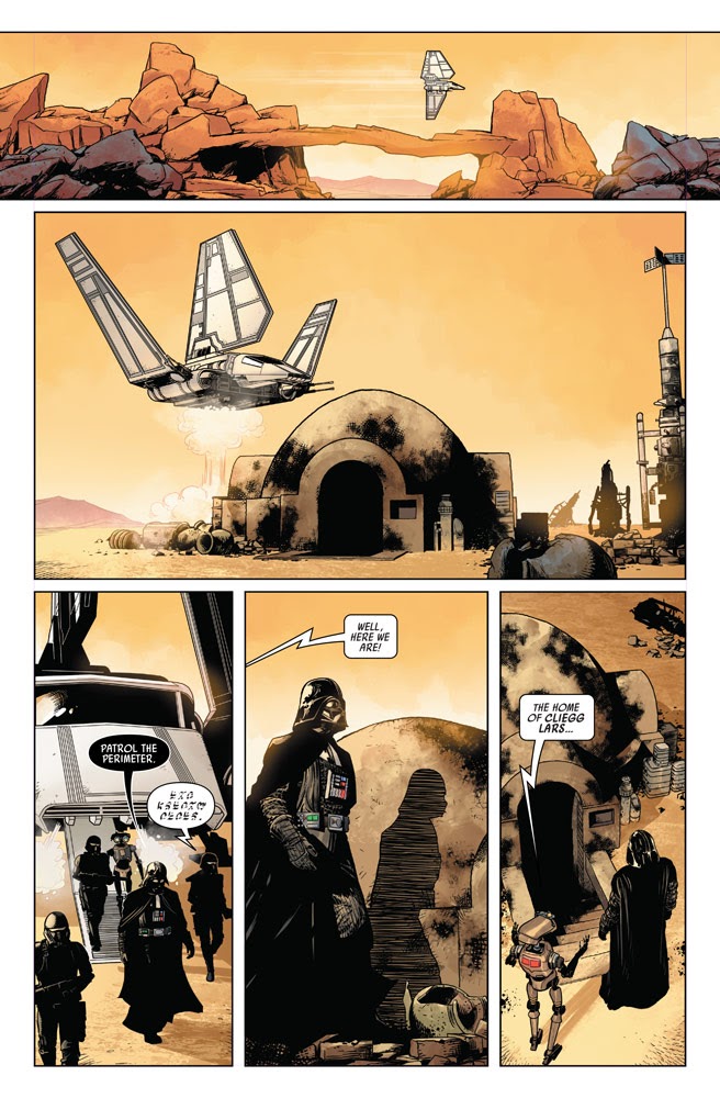 Vader and Zed decide to take a tour of Luke’s past in an effort to predict his future, bringing along some Death Troopers for good measure. Their first stop is the Lars homestead on Tatooine, where the Force-wielding boy spent most of his youth-- and where Vader himself once visited during the time when he was previously known as Anakin Skywalker. The interesting thing here is that the Dark Lord of the Sith has gone somewhat AWOL from the command of Emperor Palpatine, taking off in an Imperial shuttle before he can report to his menacing boss about the disappearance of the Millennium Falcon and its rebel passengers along with it.