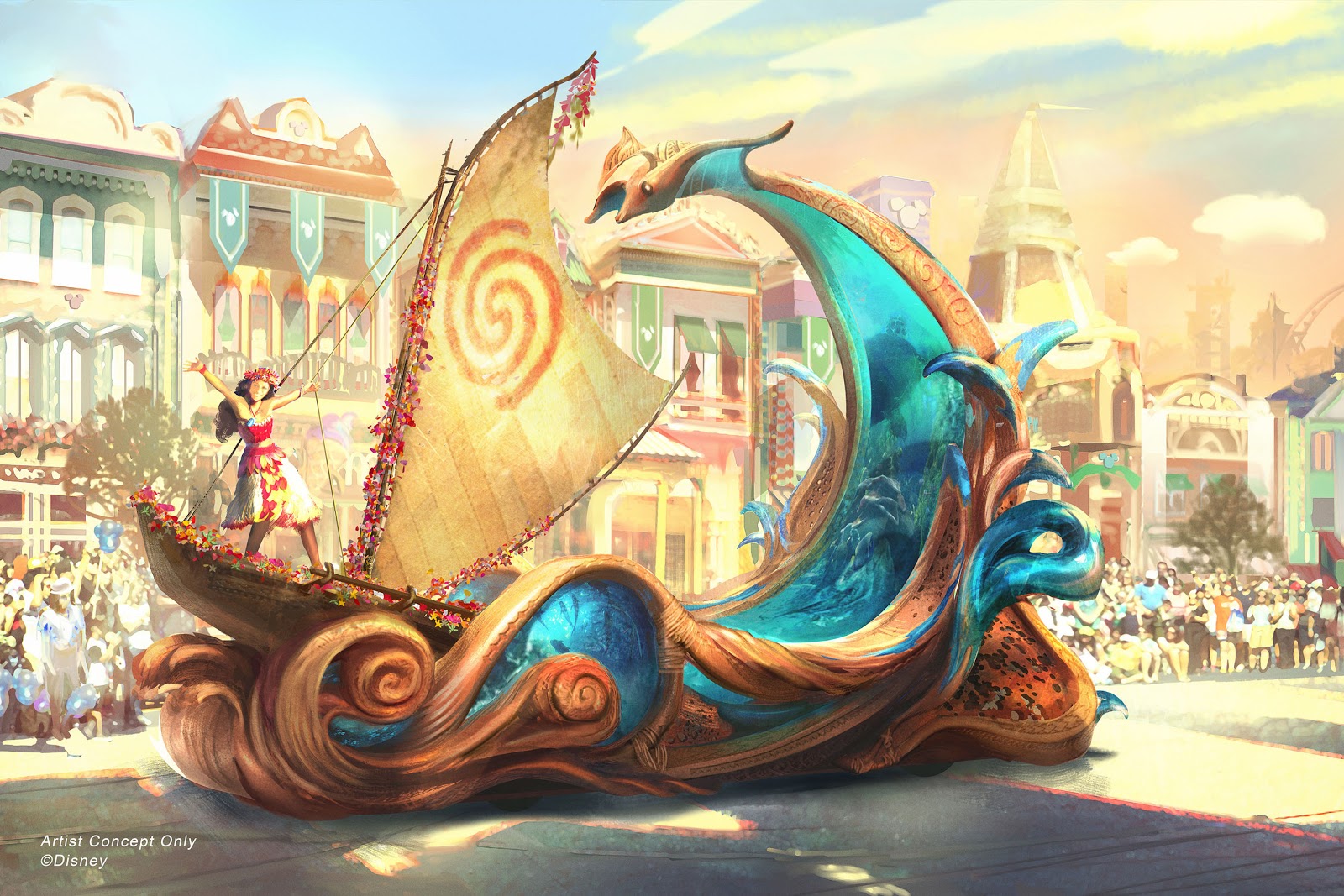 The opening dancers join Mickey, then Minnie Mouse, Donald Duck, Goofy, and Chip ‘n’ Dale-- all in sparkling new outfits fashioned specifically for “Magic Happens”-- to lead the way for all that comes after down the Disneyland parade route. They’re followed by the Moana float, which was described to us as “artistry in motion,” with the magic of the ocean embedded into its design. Here, technology enhances the storytelling through the use of an LED screen with animation giving viewers a window into the deep through Moana’s eyes. Ocean dancers also represent waves and utilize new toys they play with along the route.