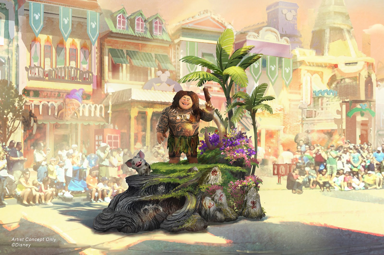 Moana is followed by Maui, and Pua, who are in turn being chased by Kakamora on a rickshaw modeled after their floating island. The life-size Hei Hei animatronic who pops his head out of a rolling basket too look around is sure to be a hit with fans of the film.