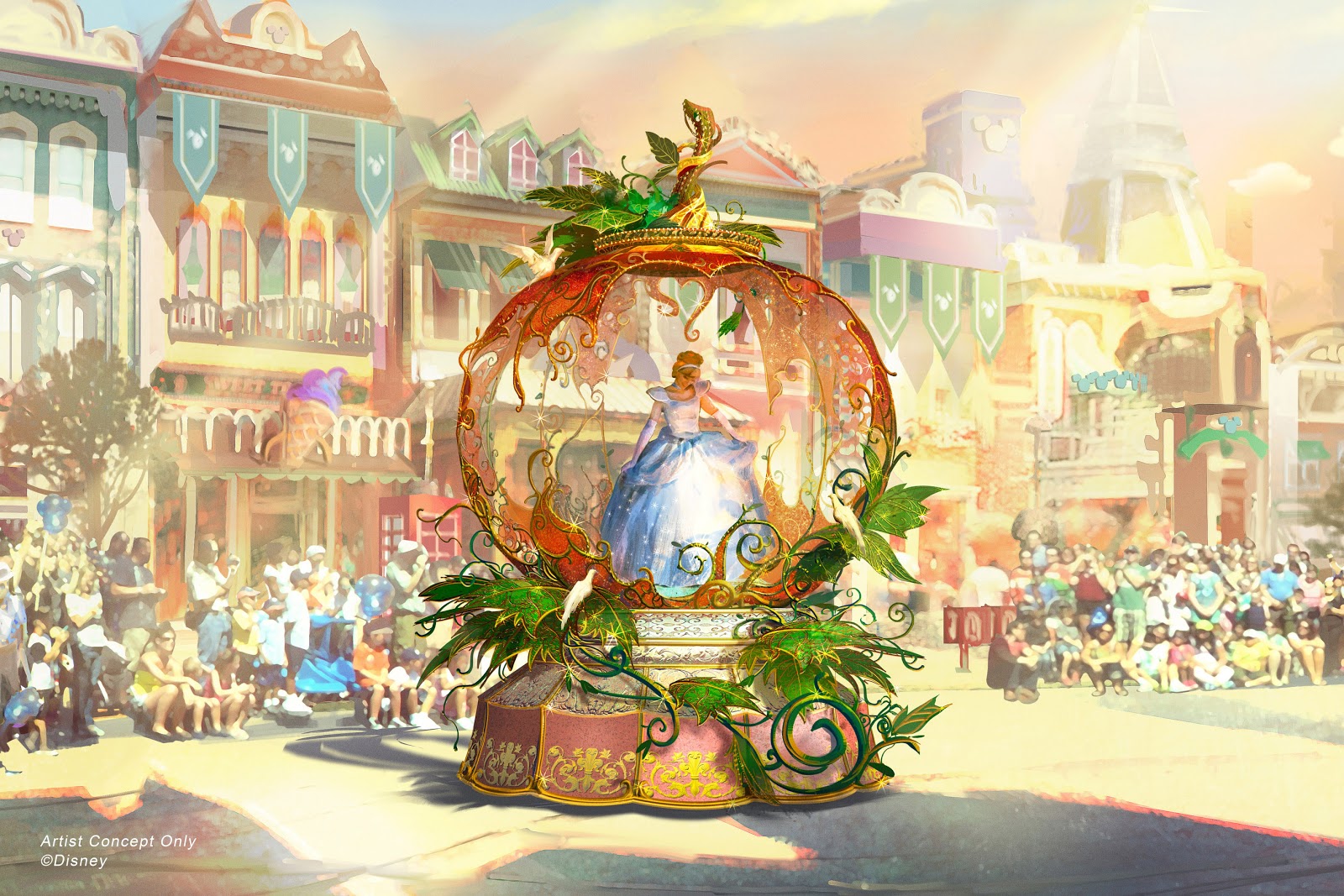 The Grand Finale of “Magic Happens” has a bit of an ironic name, as it takes up nearly half of the parade. It gets off to a magical start with Cinderella and its title character spinning and waving from a float that represents the moment her pumpkin is transformed into that iconic carriage. Cinderella’s new dress echoes the concept for the float, depicting her in mid-metamorphosis.