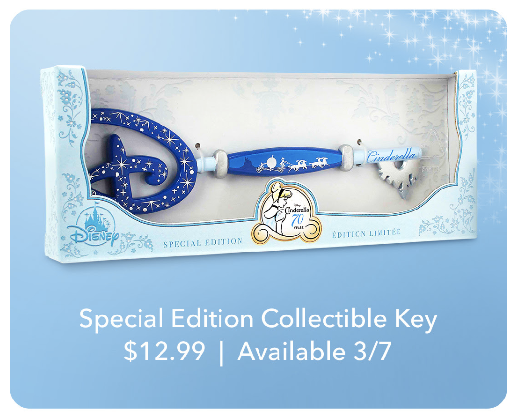 In addition to all the great items you can find on shopDisney, guests will be able to purchase this Cinderella themed special edition collectible key for $12.99 starting on March 7th. It's not clear whether this collectible will be available only on shopDisney or at Disney Stores as well.