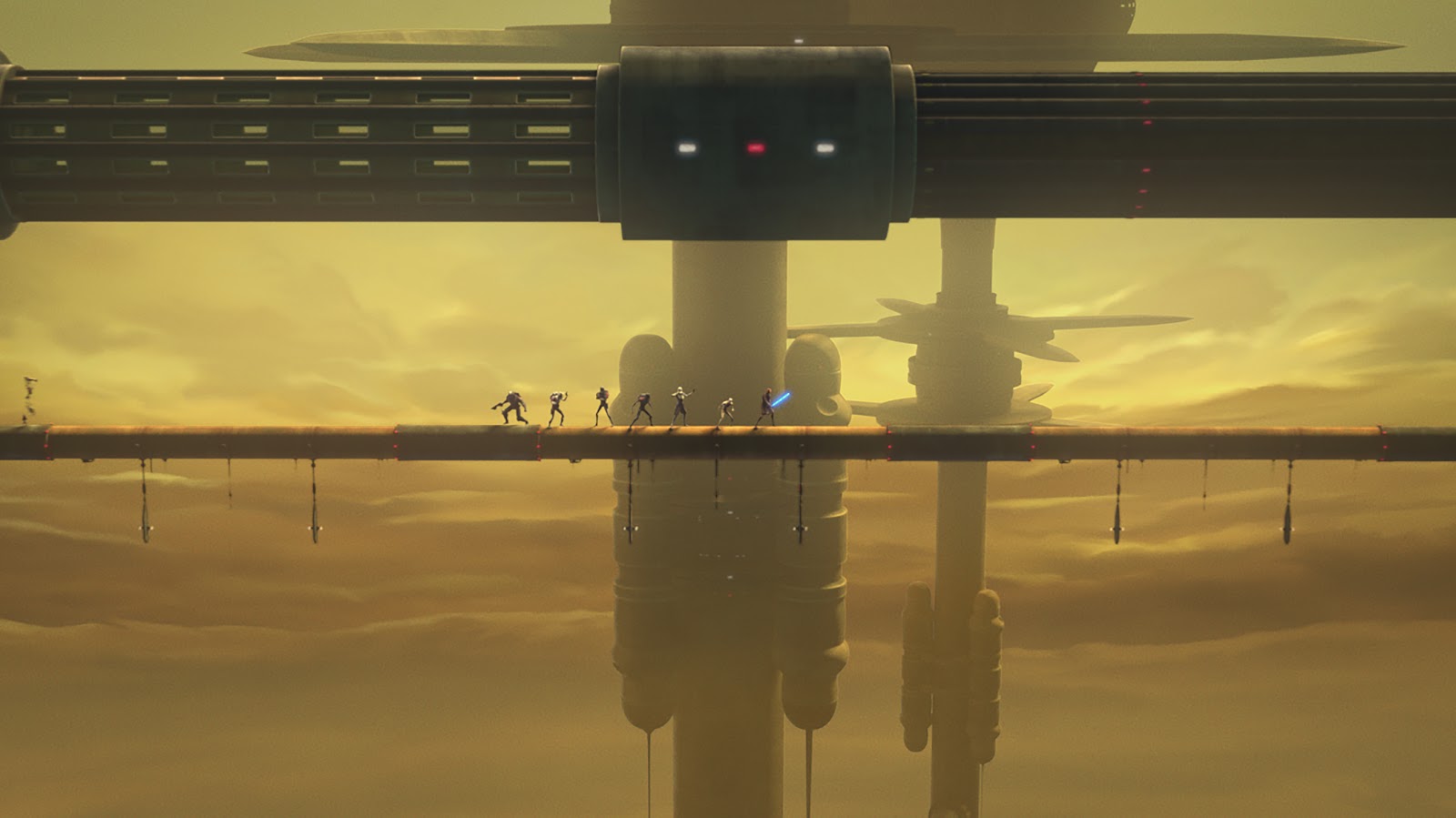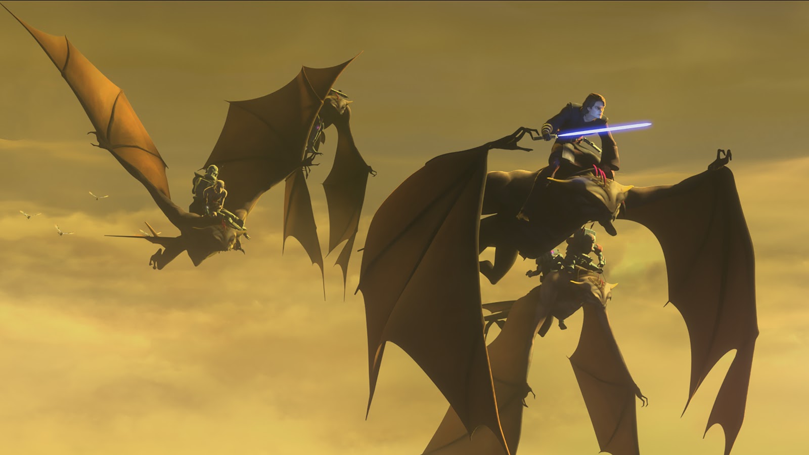 Making their way to the exterior of the station, the clones and Anakin must precariously cross a giant chasm on a big pipe. They get about halfway across and are suddenly ambushed by droids from both sides of the gap. Hunter (you guessed it-- Baker) almost falls to his death, but then Tech (do I need to tell you who voices him?) figures out a way to summon the local flying beasts called Keeradaks. They jump onto the creatures and escape, but are immediately followed by the droids, as it turns out they can also fly. “That wasn’t part of the plan,” groans Tech.