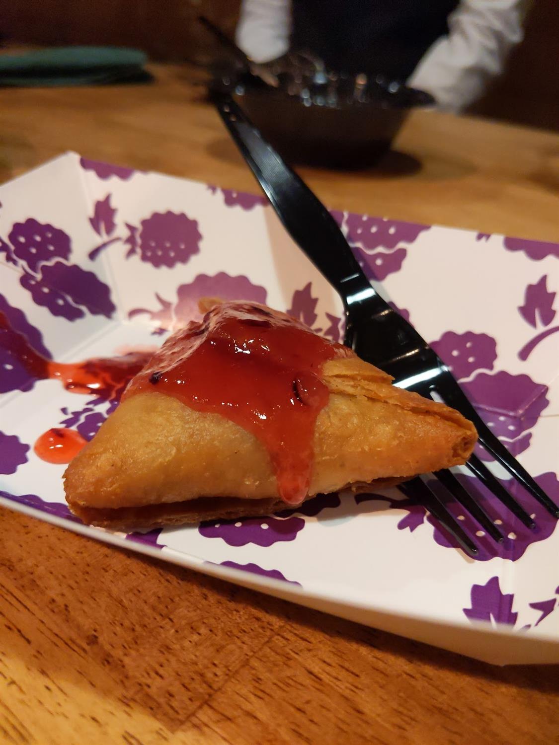 The samosas flaky crust had a pleasant crunch and stuffed with a potato veggie mix that had enough heat to longer yet not overwhelm. The accompanying boysenberry sauce was reminiscent of sweet and sour, being neither too much one or the other. I could see pairing this dish successfully with boysenberry beer or with another surprise hit: the boysenberry basil lemonade. The basil brought an earthy quality to the bright tangy and sweet beverage that made the beverage particularly refreshing. I went back for a few refills.