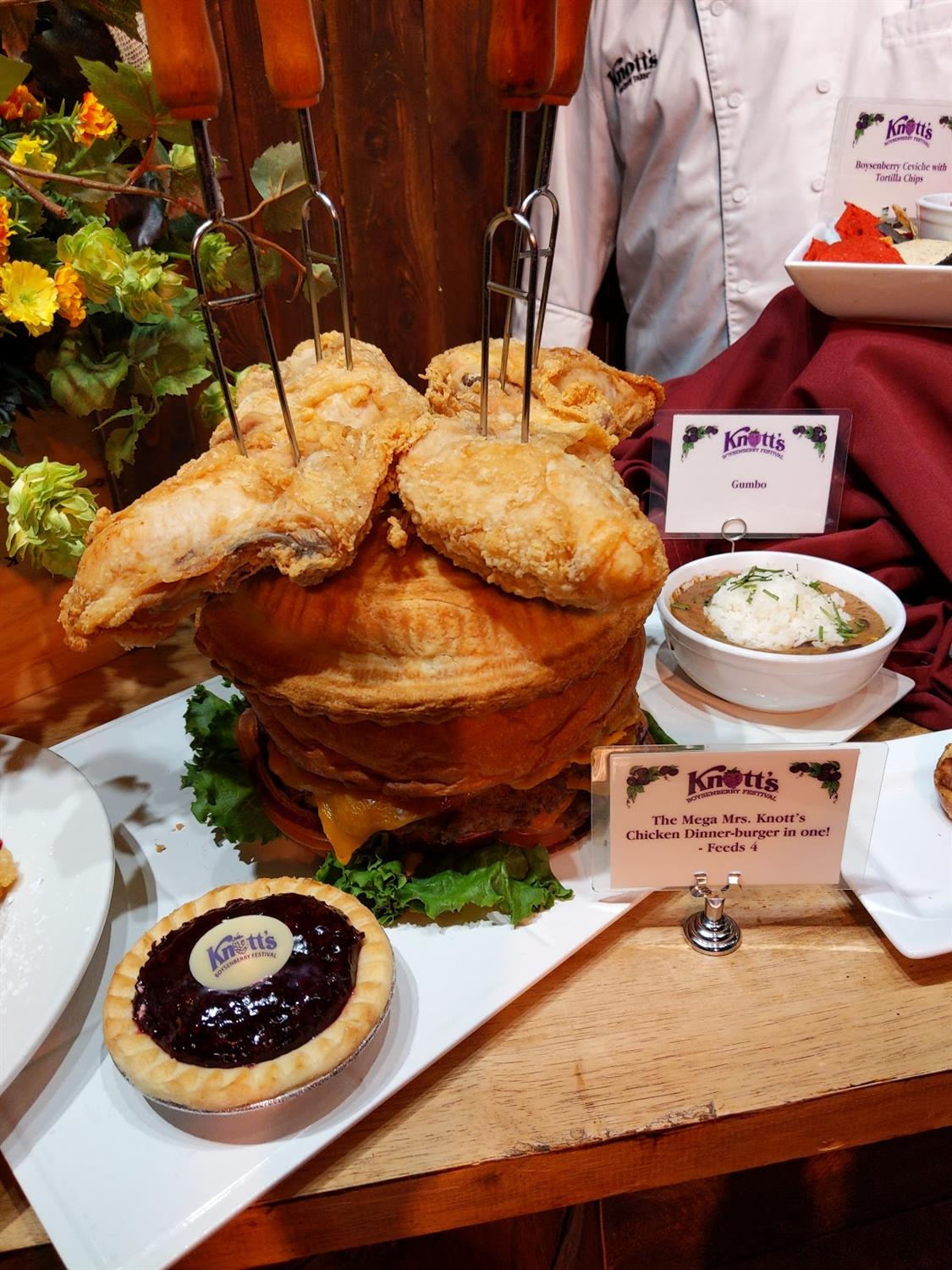And the Mega Mrs. Knott's Chicken Dinner-burger that takes an enormous four-pound cheeseburger, tops that with an upside-down Boysenberry pie and then adds four gigantic Mrs. Knott's famous fried chicken breasts.