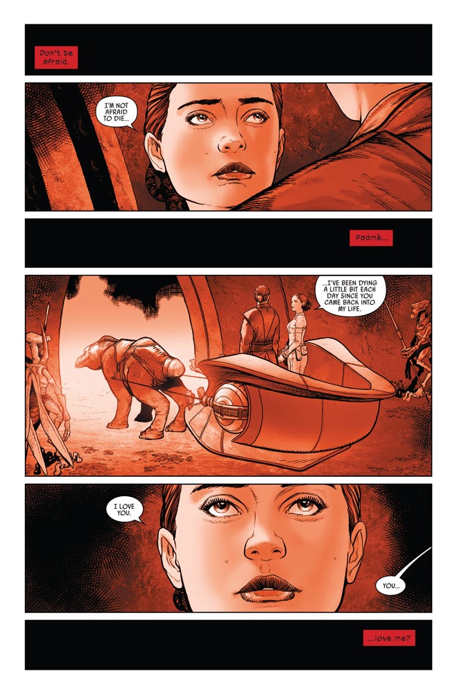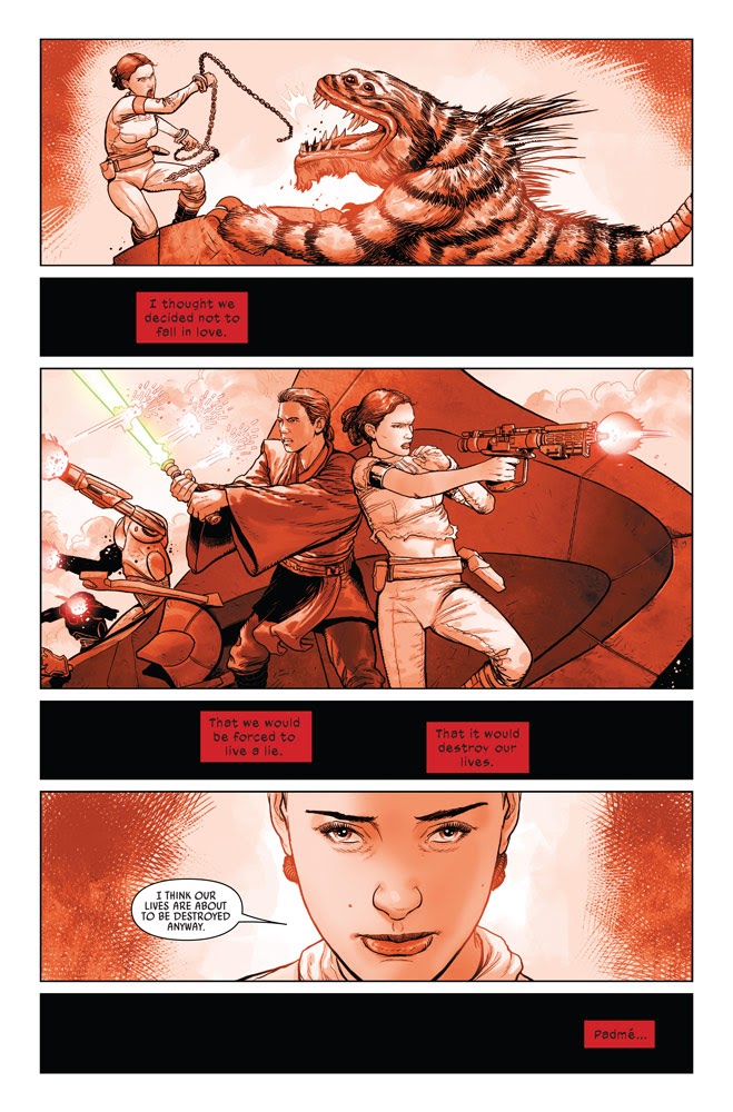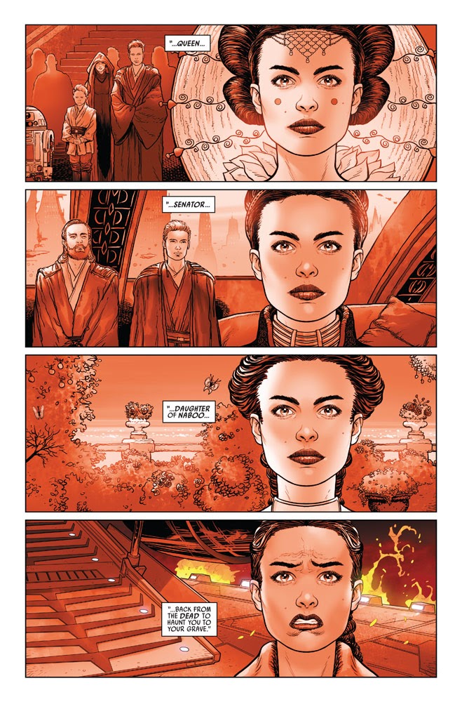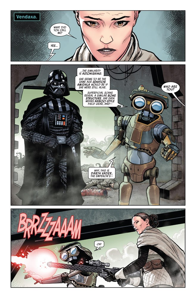 Vader has come to the planet Vendaxa, following a clue he discovered in Padmé’s abandoned apartment on Naboo in the previous issue. He finds himself face-to-face with someone who uncannily reminds him of his long-thought-to-be-deceased wife, but can it really be her? Probably not, but I won’t spoil who it really is. The truth is actually pretty interesting and opens up a whole new avenue to explore as the Dark Lord of the Sith continues on his journey. Suffice it to say that it hadn’t occurred to me after last month’s cliffhanger ending, though it probably should have.