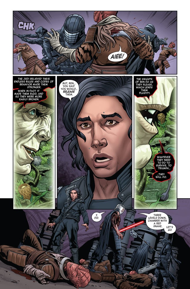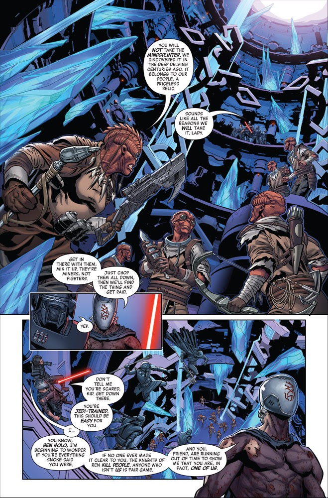 Issue #4 opens with Ben and his new pals the Knights of Ren in pursuit of a mysterious artifact known as the Mindsplinter, which takes them to the Minemoon orbiting Mimban-- a planet first seen in Solo: A Star Wars Story, appropriately enough. They slaughter some of the local Mimbanese workers, though Ben is still hesitant to participate in senseless violence. Then his former fellow Padawans show up and attempt to put a halt to the attack.