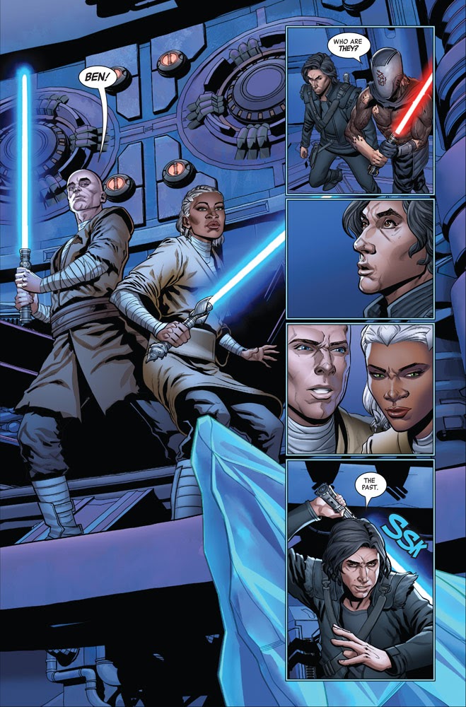 Naturally a big melee breaks out between the Knights of Ren and the Jedi-in-training, but I also don’t want to spoil how that ends-- again, you can probably extrapolate if you’re even slightly aware of how this story should unfold at this point in the timeline. The very interesting part of the battle is how Ben Solo begins to hear ominous voices and how his emotional eruption during one specific duel affects others around the galaxy via the Force. There are a few surprising (and welcome) character appearances in this issue that absolutely make sense giving Ben’s connections, both past and future, but once more I won’t spell them out in case you’ve haven’t yet read the full comic.