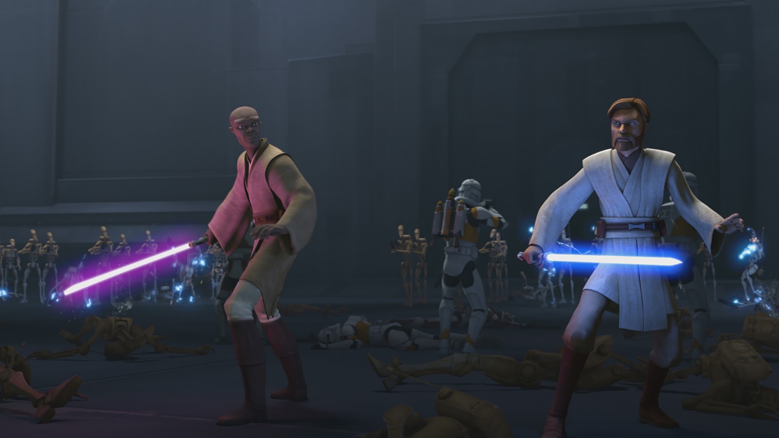 Trench wants to use the Separatist algorithm in combat again, but Echo gains access to the system just in time and makes it appear as though the signal is originating from Skako Minor. Mace Windu and Obi-Wan Kenobi (James Arnold Taylor) attack the plant, but not before Windu offers the battle droid battalion stationed there the opportunity to surrender. Not surprisingly, they don’t take him up on it. “I guess it was worth a try,” remarks Obi-Wan. Trench receives Echo’s signal and orders all droids on the planet to the assembly complex. It seems Echo’s plan is to send a feedback pulse that will shut down all the droids once they’re in the same location.