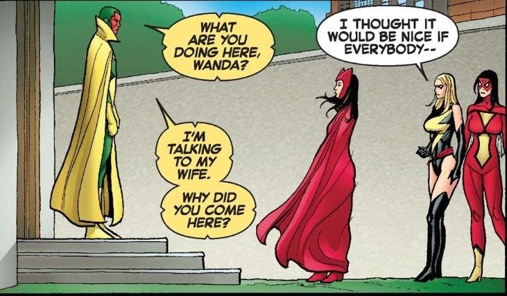 As I mentioned, Wanda’s relationship with Vision has been long and turbulent. After Wanda wipes out mutants, creates a fake reality, kills thousands and does a multitude of other terrible things, the Avengers eventually try to bring her back into the fold. However, they leave the decision up to her husband, who is not quite so welcoming. In what is one of the most emotional exchanges between the two characters, Vision explains that he will not forgive Wanda for what she has done and turns her away from Avengers Mansion. I wouldn’t expect to see Wanda do all of the terrible things she has done in the comics, but some of it could make its way into the MCU. The seed has already been planted for her to occasionally lose control of her powers in Captain America: Civil War. With that being the case, it would be interesting to see a falling out between Wanda and Vision and could make for a very powerful scene.
