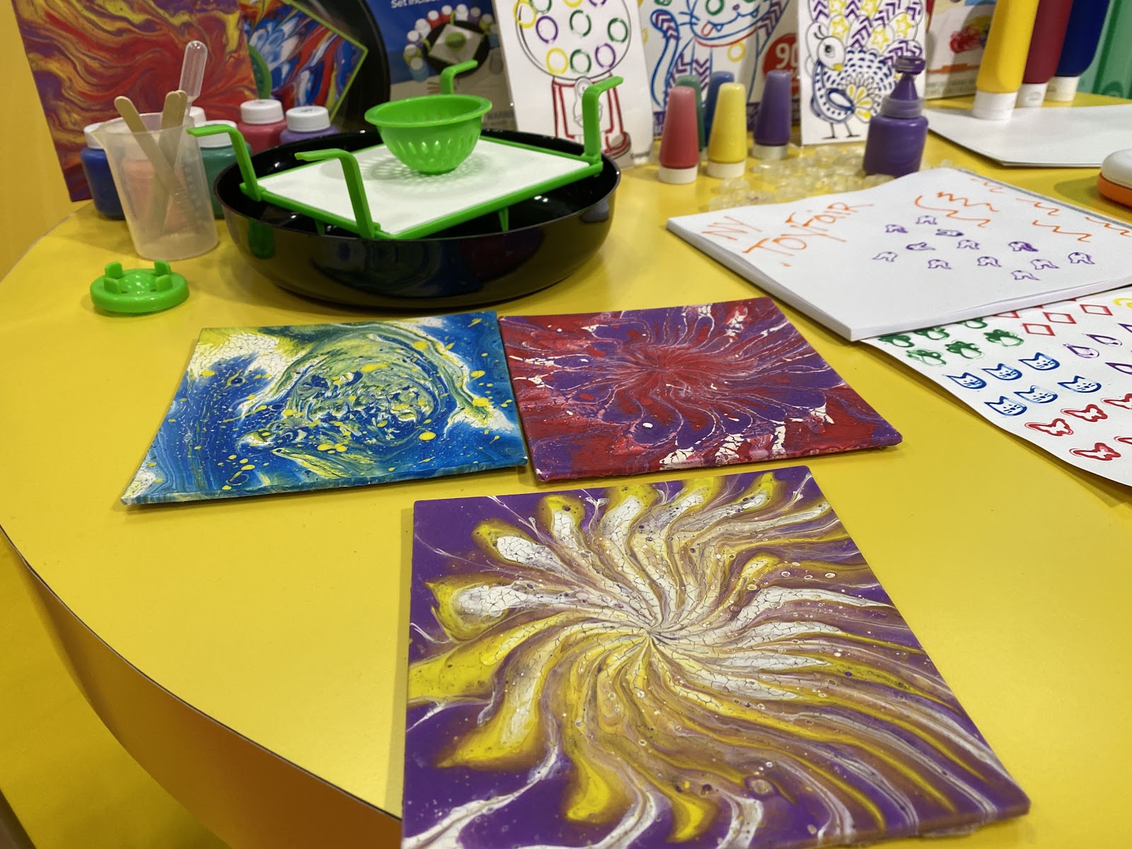 Another fun activity is the Washable Paint Pour Art Set. Unlike similar products that use acrylics, which are hard to clean up and can leave permanent stains, these are easy to wash and even come with a trey wider than the canvas spinner to catch the paint that drips off.