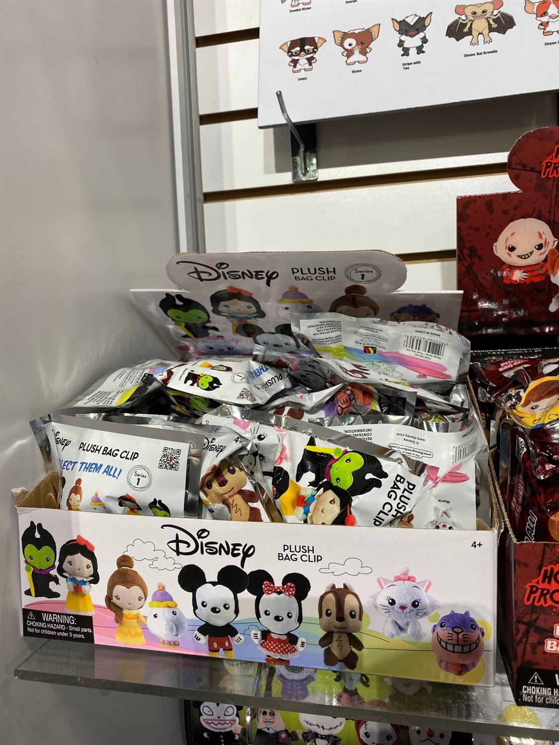 Another new item in a similar blind bag are plush bag clips with Disney characters like Mickey and Minnie Mouse, Snow White, Belle, Maleficent, Marie, Stitch, Angel, and the Cheshire Cat.