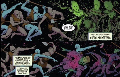 This issue essentially summarizes the history between the Kree and the Skrulls, cramming years of story into just a few pages. You really get to read several Marvel stories in one comic, as the main story throws in these Kree/Skrull history lessons throughout. It really helps to provide a great deal of context for those who may not be familiar with this long-running Marvel story, and serves as a nice refresher for those who maybe read these comics a long time ago.