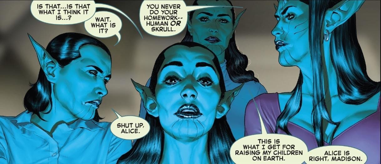 Even with all of that information crammed into one comic, it sill manages to tell a present day story as well. We were introduced to a family of Skrull operatives disguised as humans a year ago in a series titled “Meet the Skrulls.” Don’t worry, you don’t have to read that whole series to get what is happening here. Their story is summarized in the first couple pages of this comic.