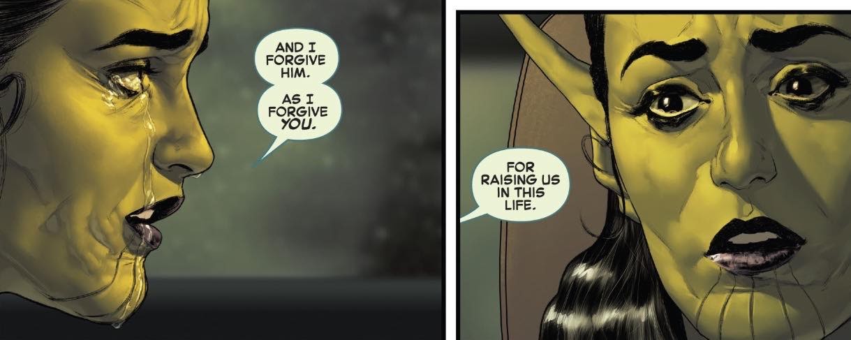 We find the recovering family of Skrulls on a mission to learn more about a project humans are working on to reveal Skrulls living among them. What they find is a relic that leads to a history lesson and a debate as to whether or not they should be at war in the first place.
