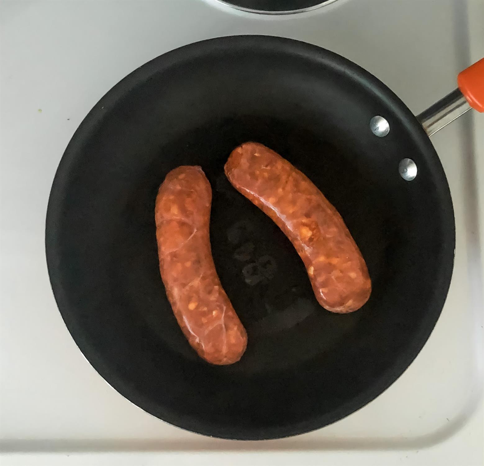 1) Preheat the oven to 350°F.2) Cook the chorizo in a pan over medium heat for about one to two minutes until most of the oil is released. If you’re using fresh chorizo like we did, you won’t get much oil in the pan. At least, there likely won’t be enough that you will need to drain the pan after cooking. Instead of watching for the amount of oil, cook the sausage until it is easy enough to dice.