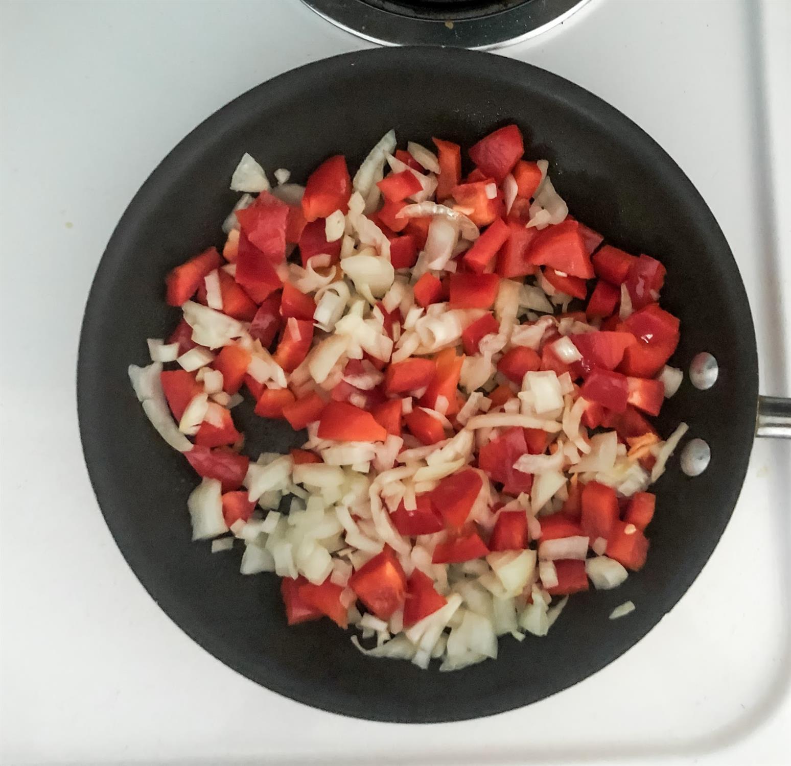 3) Dice the onions and pepper. In about 1 tablespoon of the chorizo oil cook them until translucent. Again, if using fresh chorizo, simply cook the vegetables in the same pan used for the sausage.