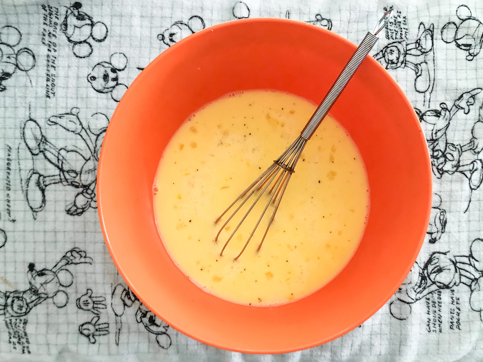 4) In a bowl, whisk together eggs and milk. Season mixture with salt and pepper and set aside.