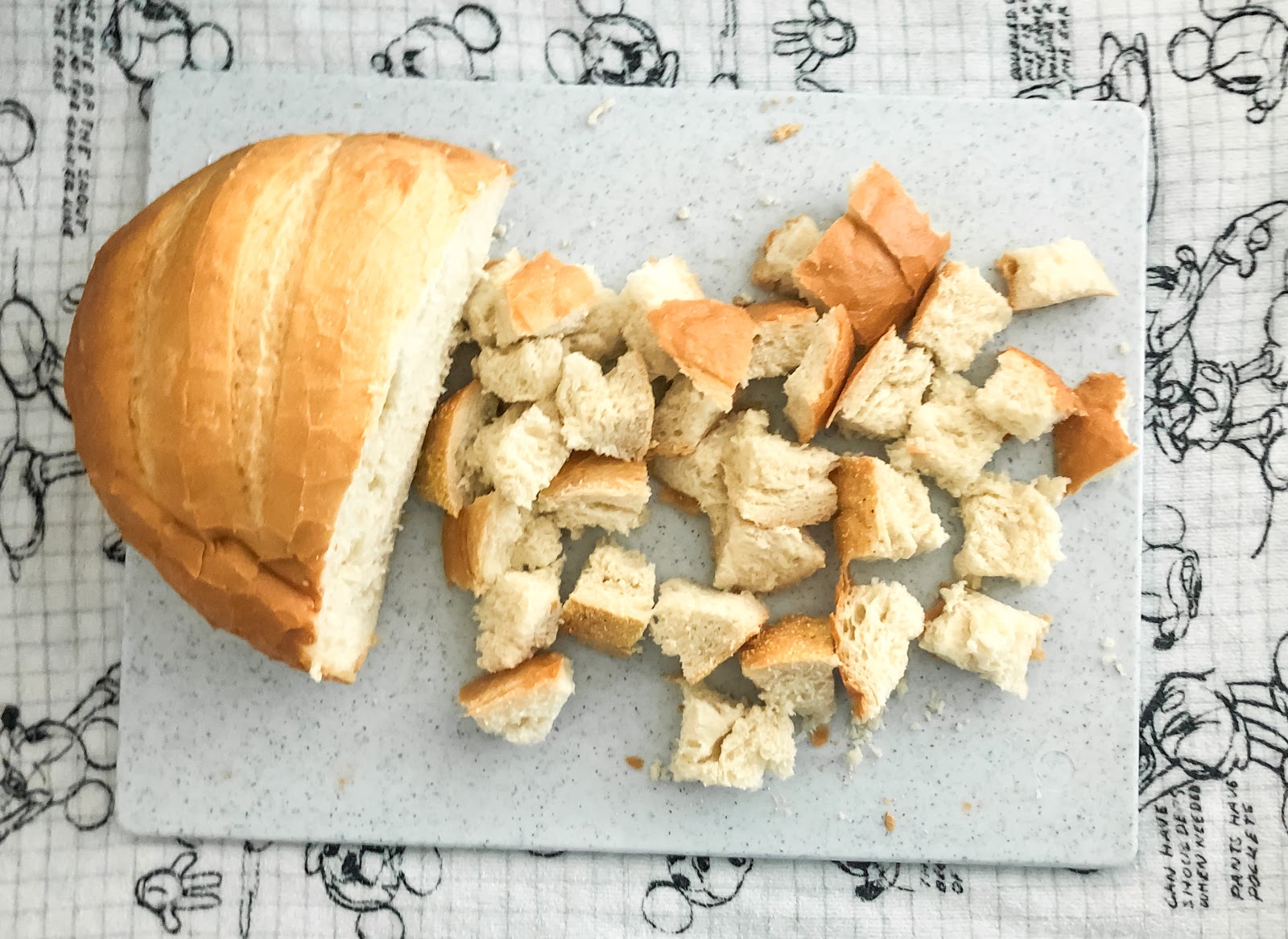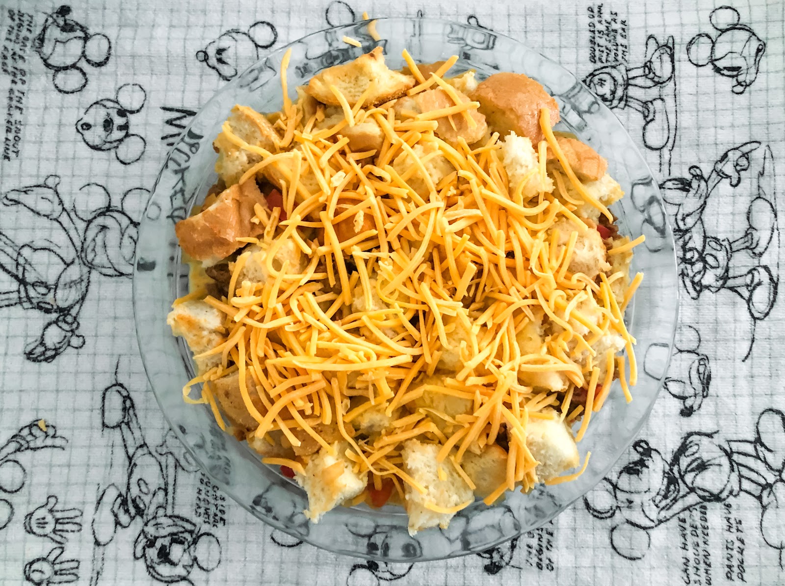 6) Layer bread, chorizo, onions and peppers in an 8-inch baking dish. The dish we used was slightly bigger, and we actually found that we could have used one that was even a bit bigger than that.