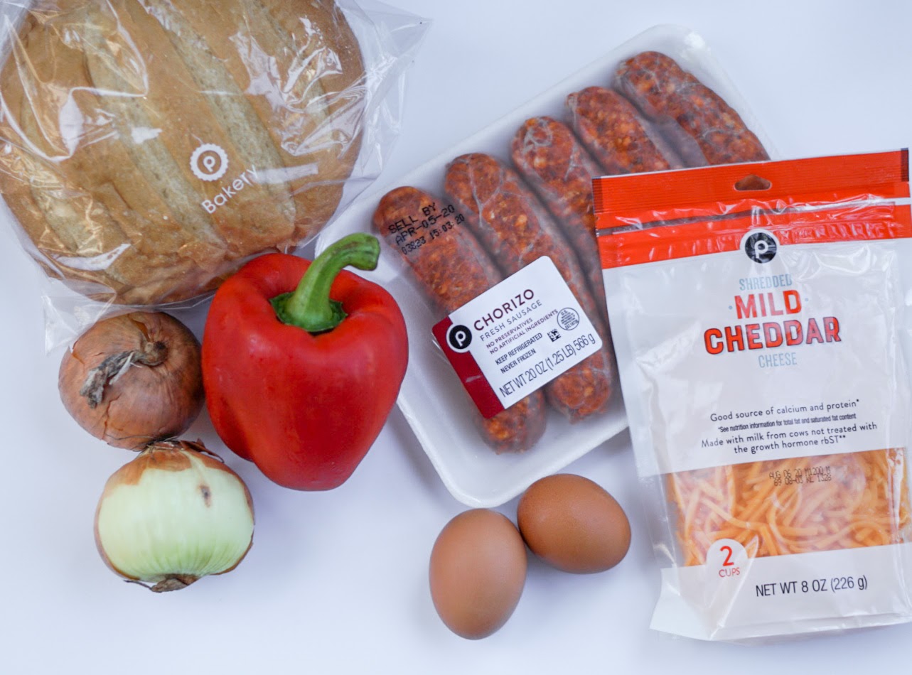 6) Layer bread, chorizo, onions and peppers in an 8-inch baking dish. The dish we used was slightly bigger, and we actually found that we could have used one that was even a bit bigger than that.